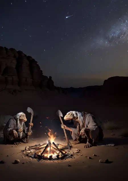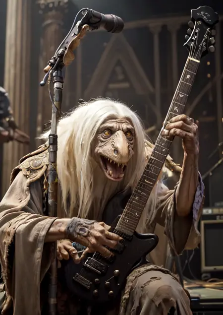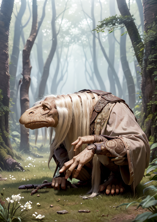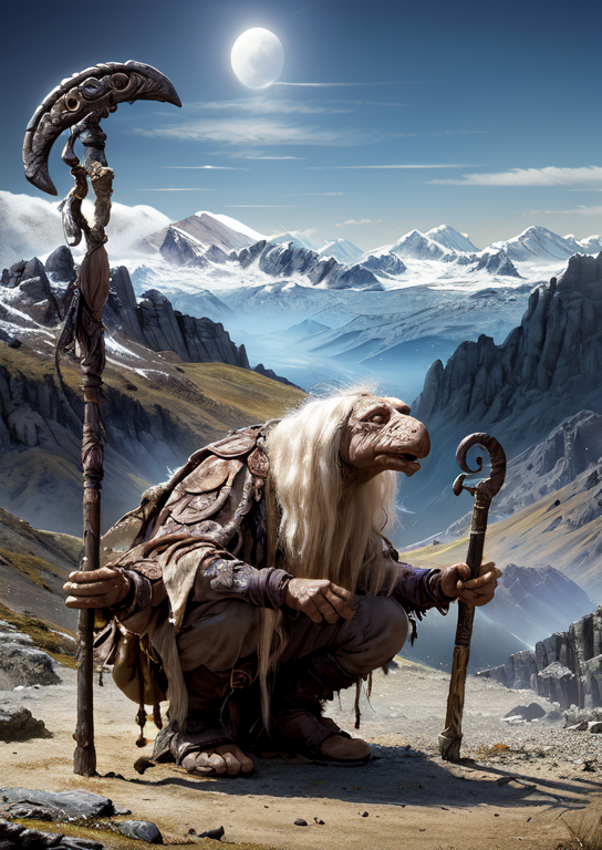 A good one would be: 'dmystic, mystic, dino face, hunched over, long white hair, wearing grey robes, full body, holding staff, fantasy room background, lora:Mystics\_Dark\_Crystal:1'