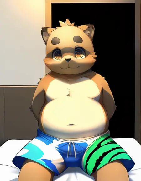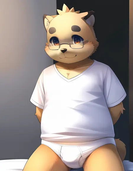 Related words : brown fur, two-tone fur, body fur, brown hair, brown eyes, tareme, thick eyebrows, dog boy, dog ears, raccoon ears, animal ears, animal nose, snout, glasses, open clothes, short sleeves, jeans, denim, shoes, camera, male_swimwear, white male underwear