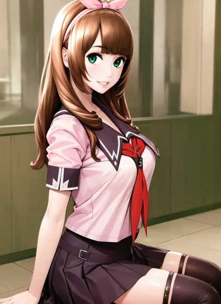 hair bow, pink hairband, school uniform, pink shirt, short sleeves, neckerchief, pleated skirt, thighhighs