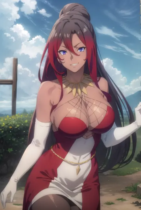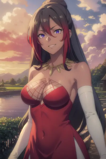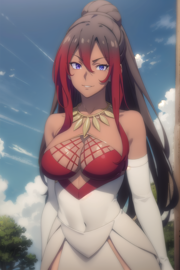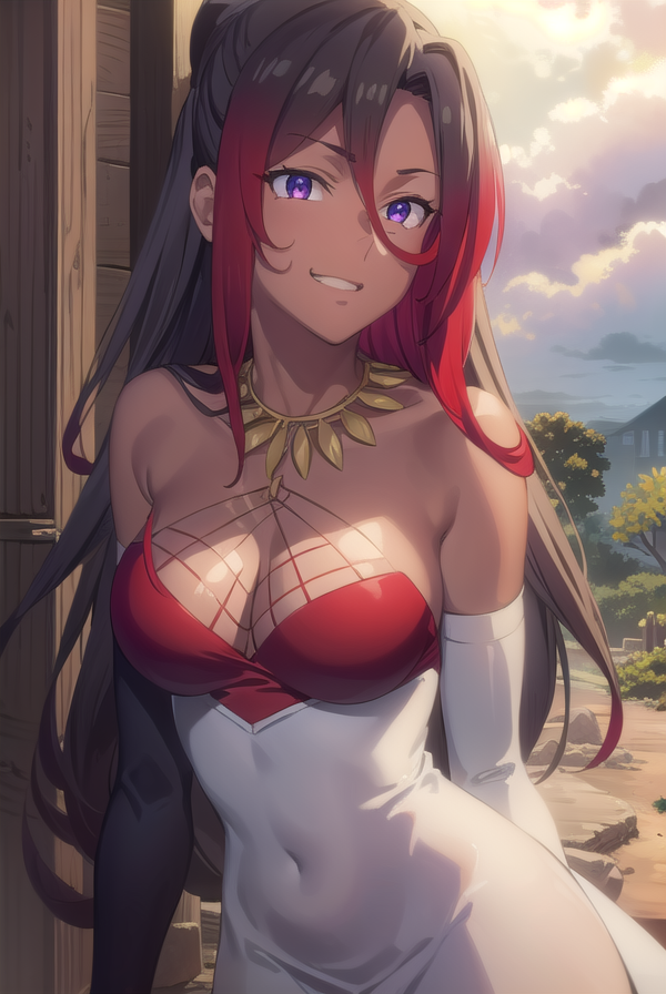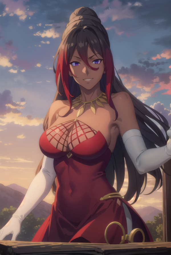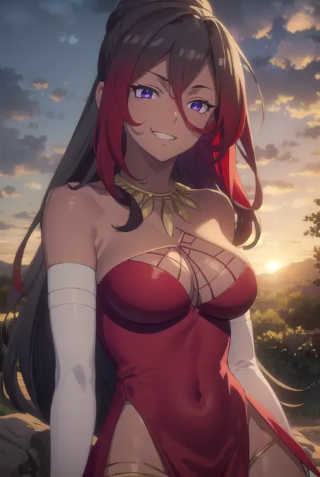 sylvia, long hair, brown hair, hair between eyes, ponytail, red hair, multicolored hair, dark skin, dark-skinned female, (purple eyes:1.1),
