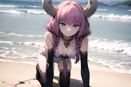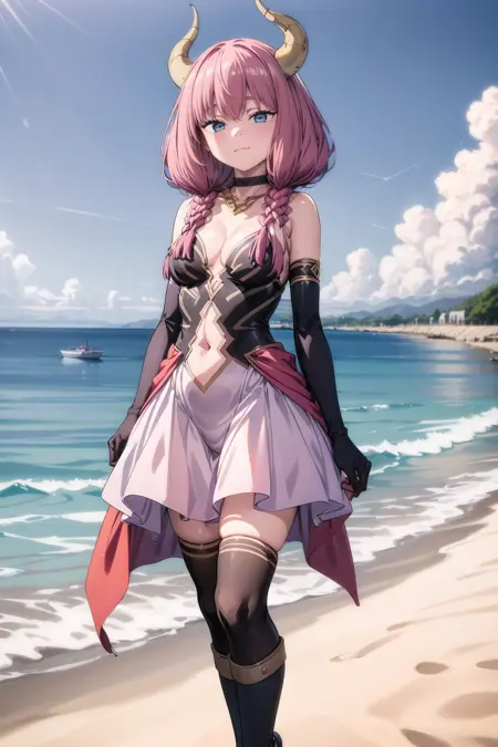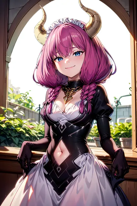 影響を与えるプロンプト:danntoudainoaura、デーモンホーン、デーモンガール、ツインブレード。タグ「danntoudainoaura, 1girl, solo, demon horns, demon girl, navel, long hair, elbow gloves, dress, thighhighs, navel cutout, boots, choker, bare shoulders, twin braids」を含めることは、公式衣装を生成するのに不可欠です。