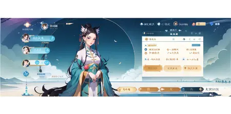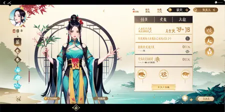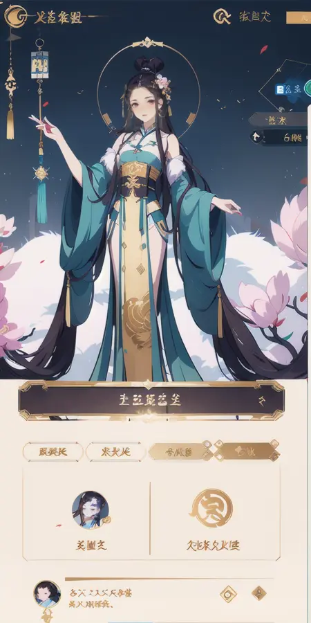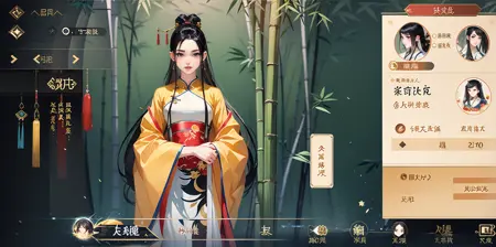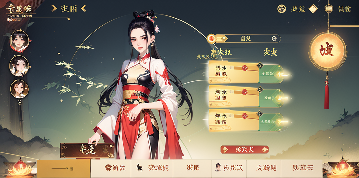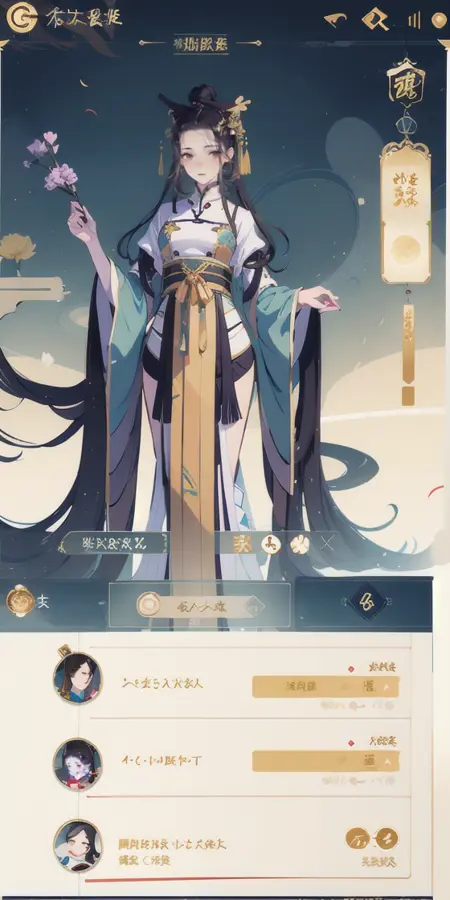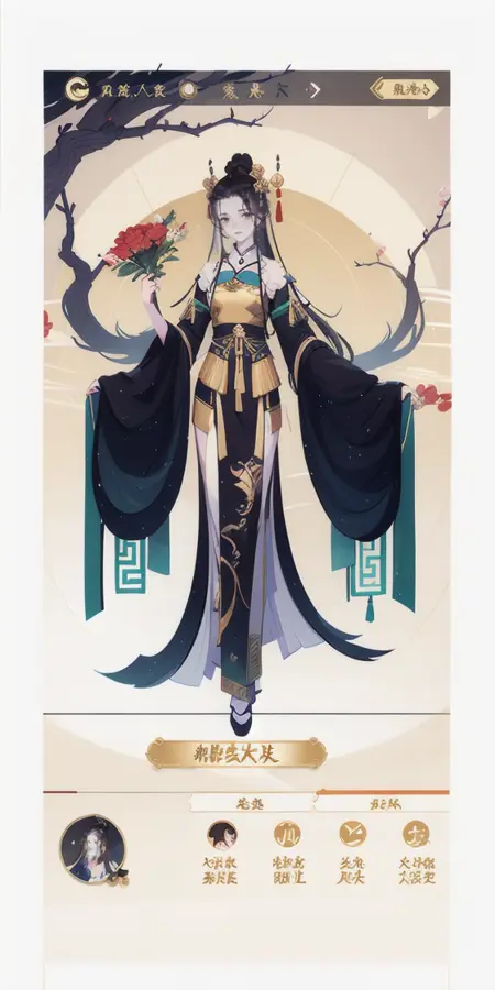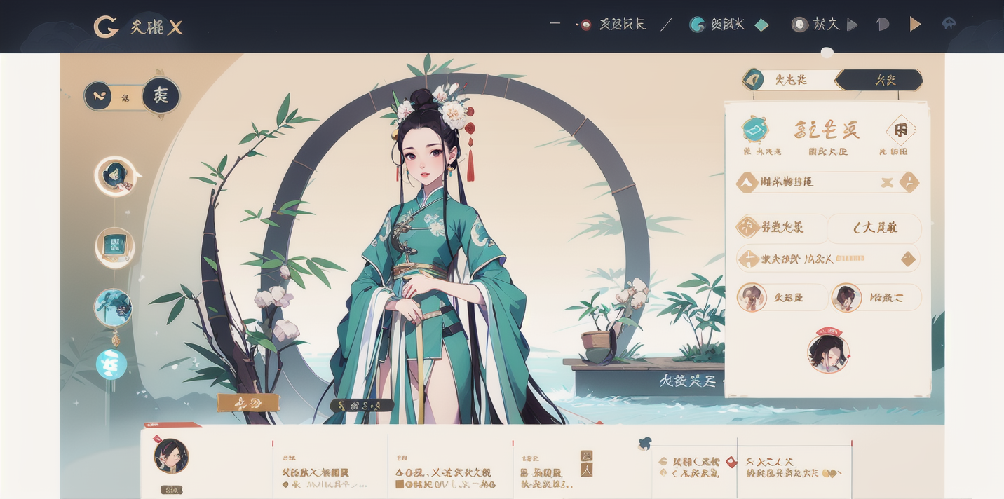 Game interface, return, tab, button, 1girl, black hair, long hair, bamboo, chinese clothes, dress, solo, upper body