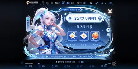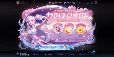 创建游戏活动界面,游戏界面,活动,弹出窗口,1个女孩,手持武器,粉色裙子,白发,按钮,关闭,图标,标志,粉红色渐变,星星,花朵,柔和,高清,精致,