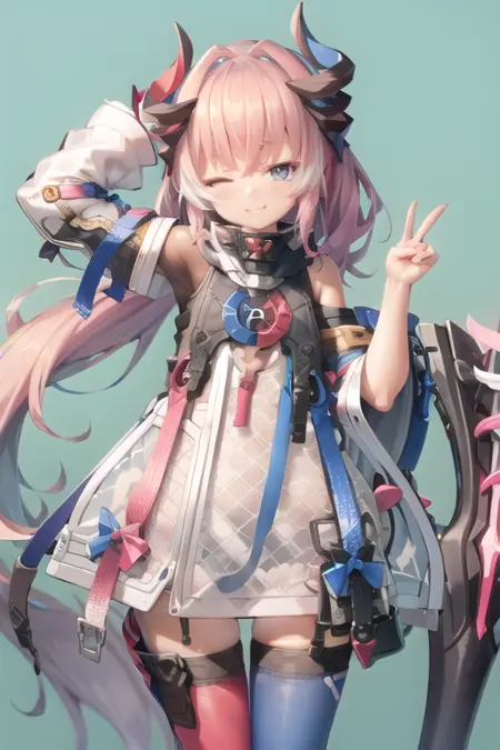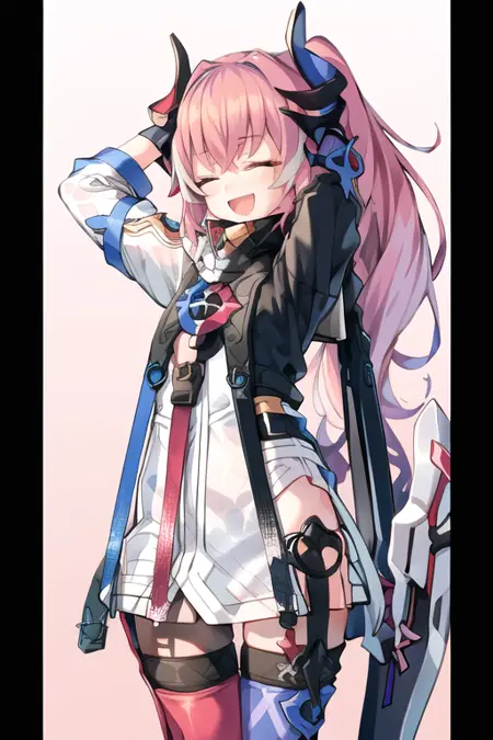 可在提示词中添加 (袜子不匹配, 长发:1.15),并在负面提示词中添加 (尾巴, 机械尾巴, 武器, 剑, 持握, 持握武器, 持握剑:1.15),以获得更好一致性。