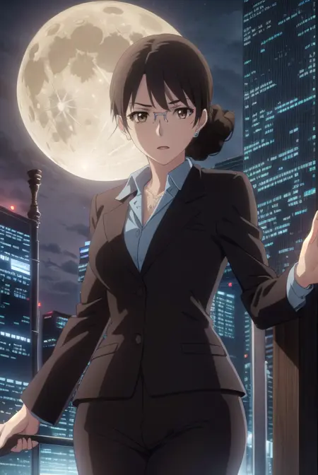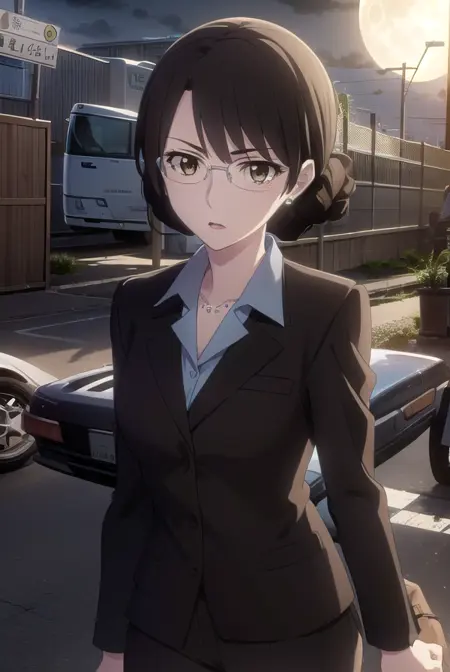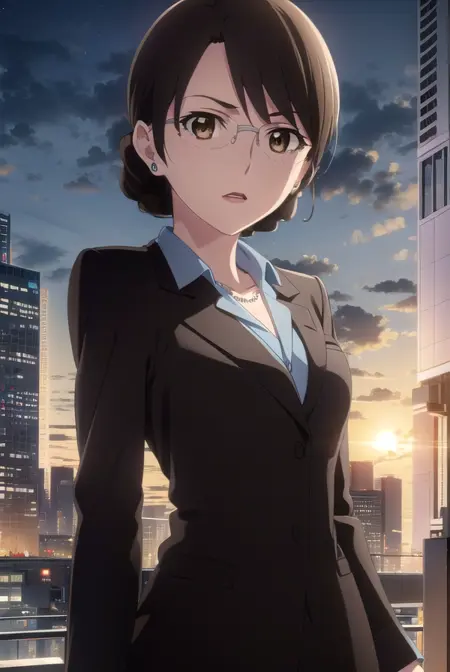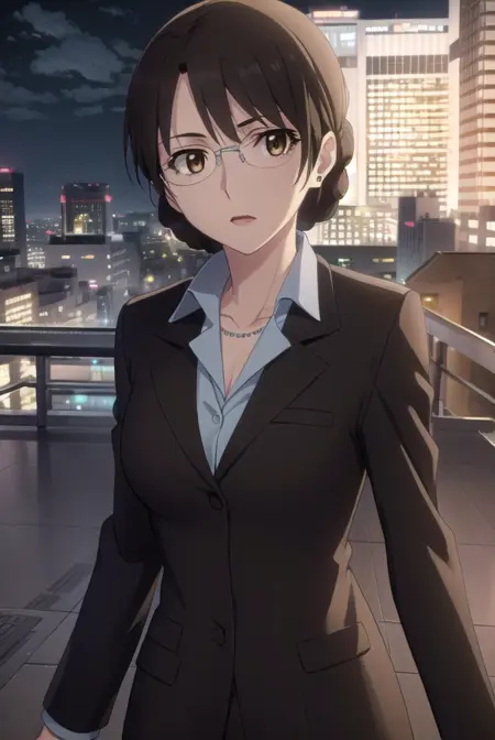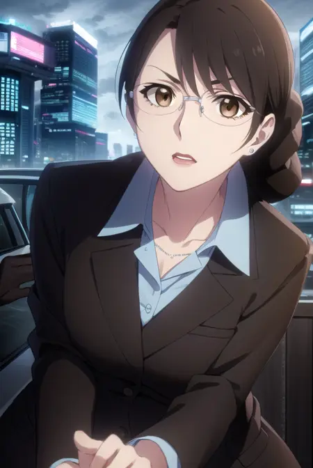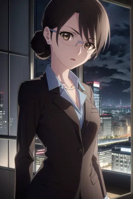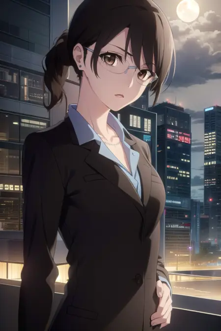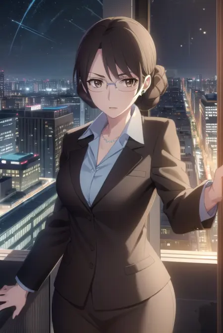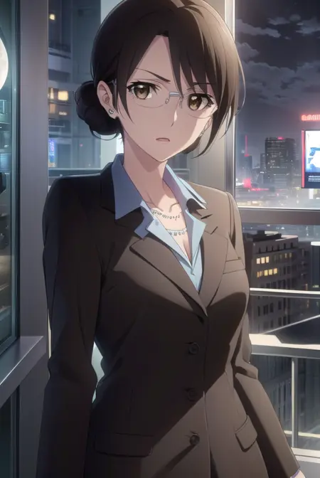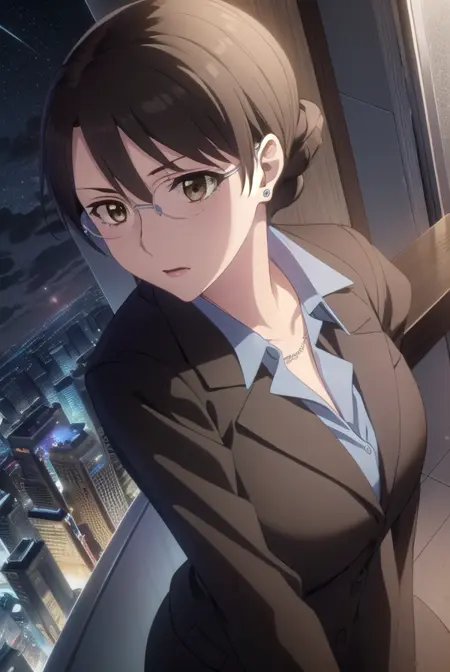 aki kikuchihara, brown hair, (brown eyes:1.5), glasses, mature female,