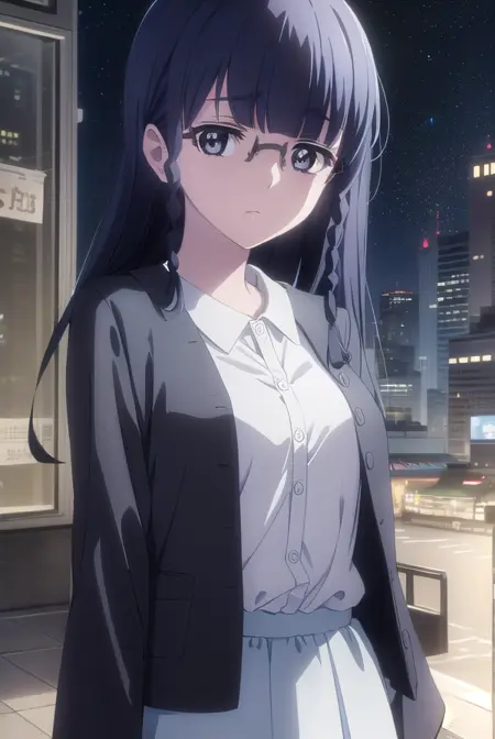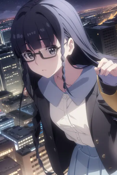 setsuna shimazaki, long hair, bangs, (black eyes:1.5), black hair, braid, glasses, blunt bangs, twin braids, semi-rimless eyewear, under-rim eyewear,