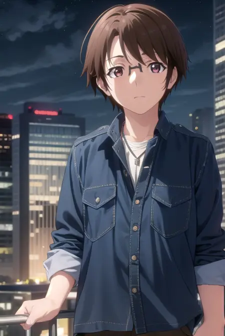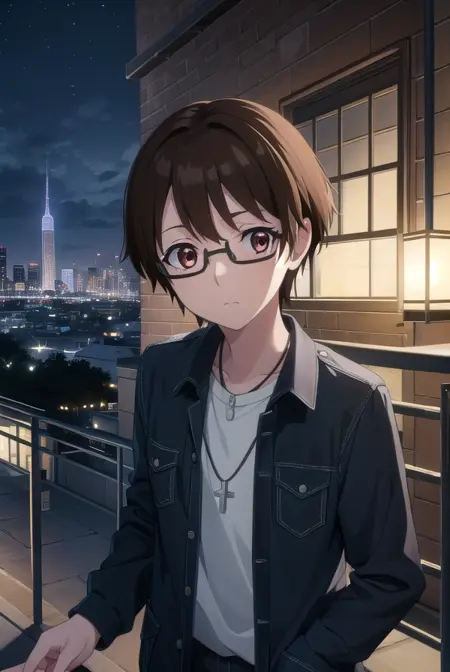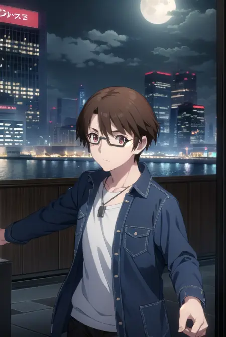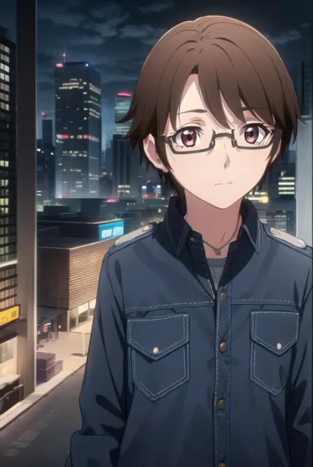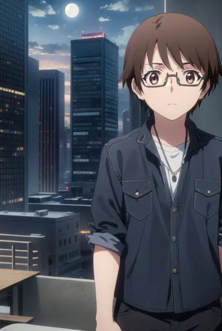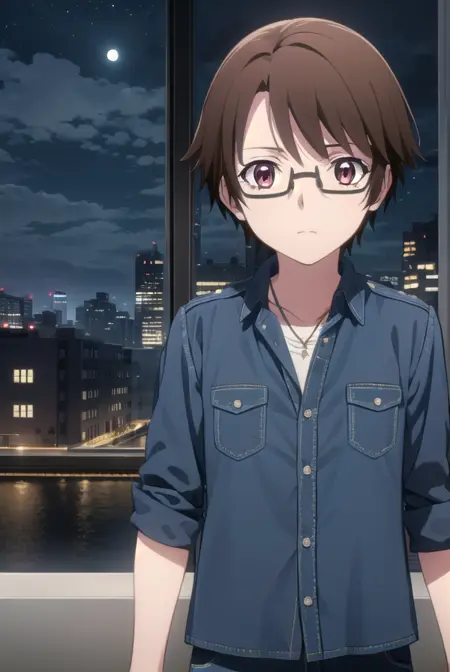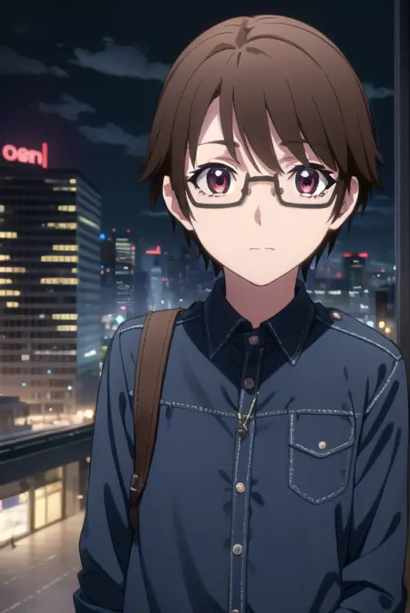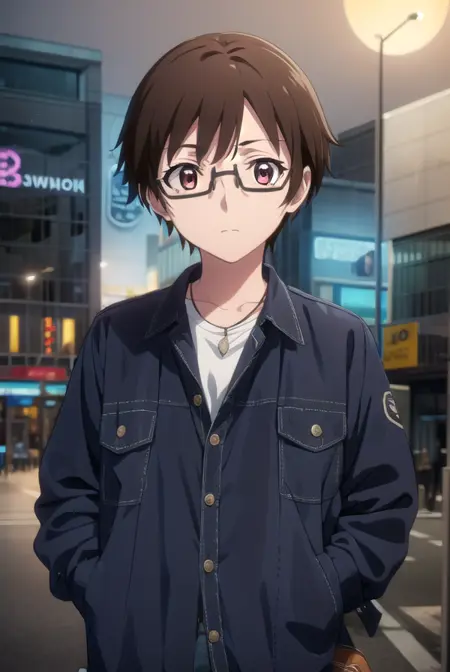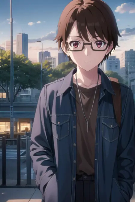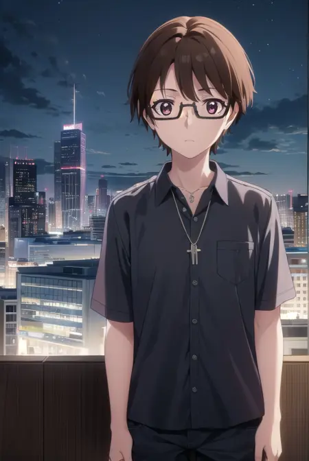 souta mizushino, brown hair, (brown eyes:1.3), male focus, glasses,