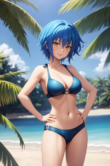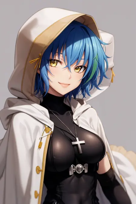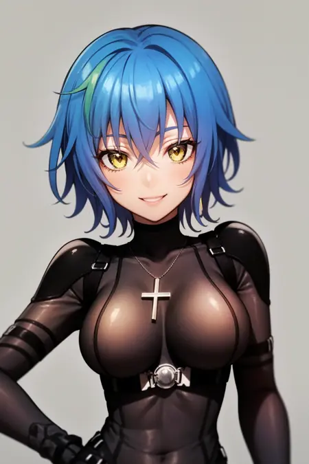 Basic prompts : 1girl, blue hair, streaked hair, hair between eyes, short hair, yellow eyes