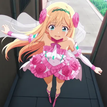 riones, it's a full body shot of a girl. She has long blonde hair and green eyes. Her breasts are small. She seems to be crying and tears on her face. She is wearing magical girl outfit. Her magical girl outfit looks dirty. She wears a skirt decorated with pink frills and pink roses. A white leotard with pink frills and green stripe is worn under the skirt. She wearrs pink high heels decorated with footwear flower and leg ribbon. On her neck,she is wearing a pink flower choker with neck ribbon,and a short necktie also. arm warmers with pink frills. She wears green hairband,hair flower and bridal veil . She also wears earrings.