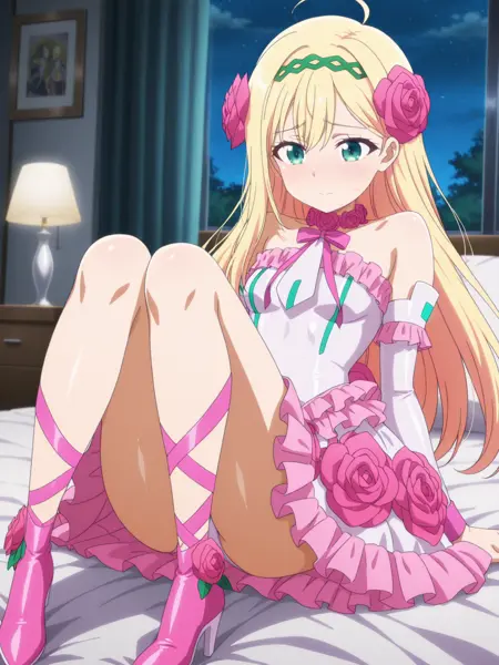 riones,bare shoulders,strapless leotard,white leotard,pink skirt,dress flower,white arm warmers,leg ribbon,ankle boots,high heel boots,pink footwear,green hairband,hair flower,pink choker,short necktie,very long hair,blonde hair,green eyes