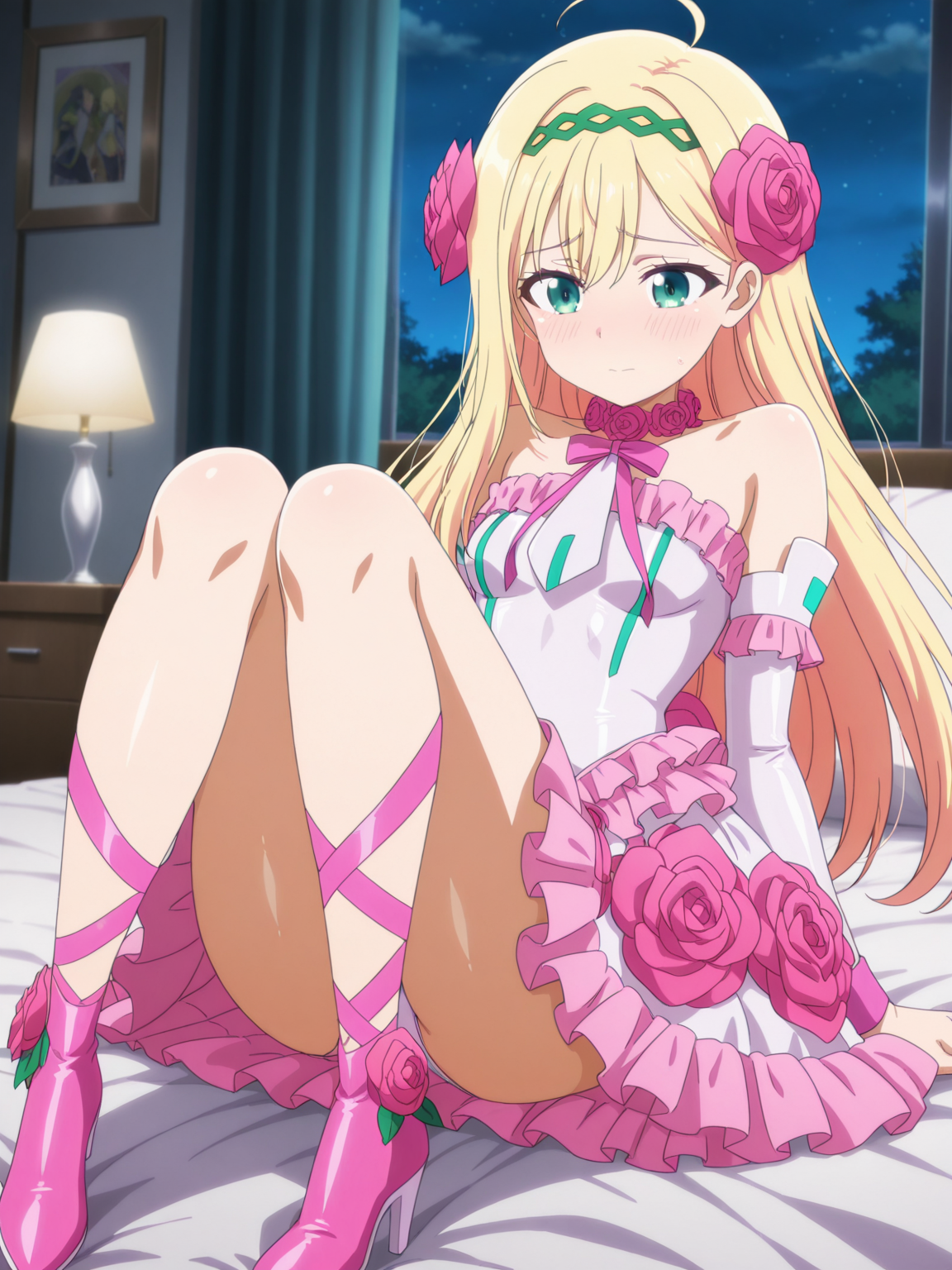 riones, it's a full body shot of a girl. She has long blonde hair and green eyes. Her breasts are small. She seems to be crying and tears on her face. She is wearing magical girl outfit. Her magical girl outfit looks dirty. She wears a skirt decorated with pink frills and pink roses. A white leotard with pink frills and green stripe is worn under the skirt. She wearrs pink high heels decorated with footwear flower and leg ribbon. On her neck,she is wearing a pink flower choker with neck ribbon,and a short necktie also. arm warmers with pink frills. She wears green hairband,hair flower and bridal veil . She also wears earrings.