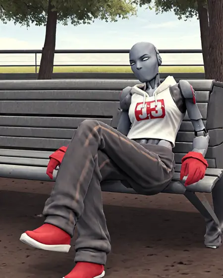 MK3: 흰색 "13" 후드티, 트랙 팬츠, 스니커즈, 짧은 빨간 장갑