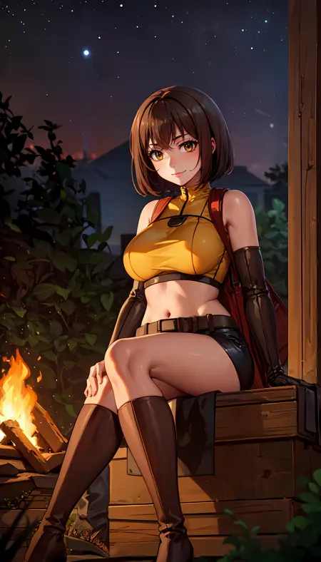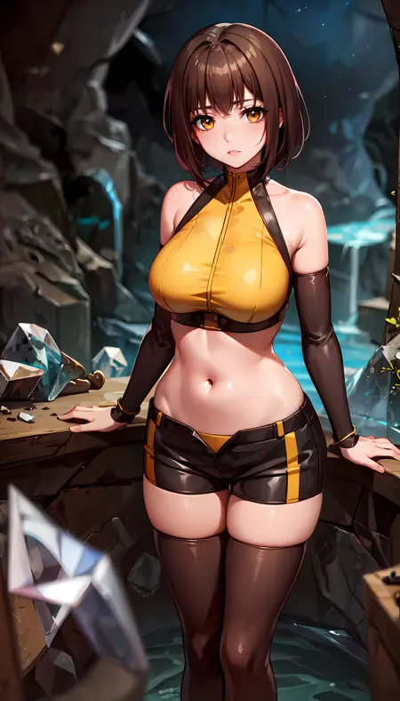 yellow top, bare shoulders, detached sleeves, short hair, brown hair, yellow eyes, navel, black shorts shorts, tall leather boots