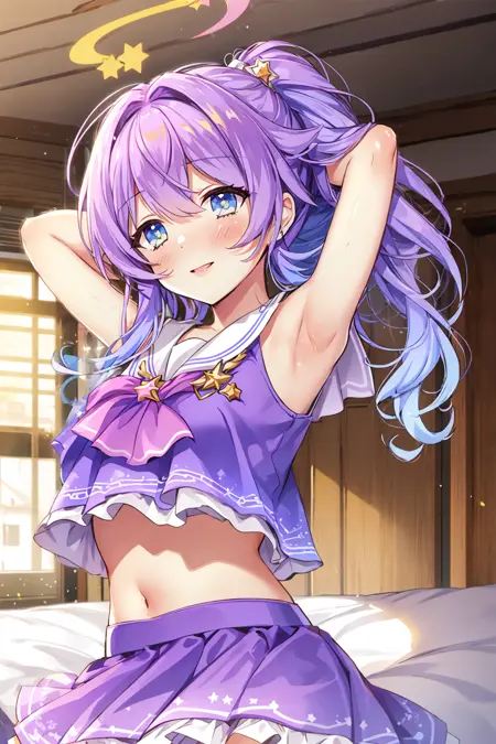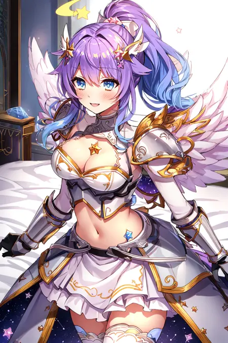 multicolored hair,medium breasts,purple hair,halo,star (symbol),blue hair,long hair,white wings,