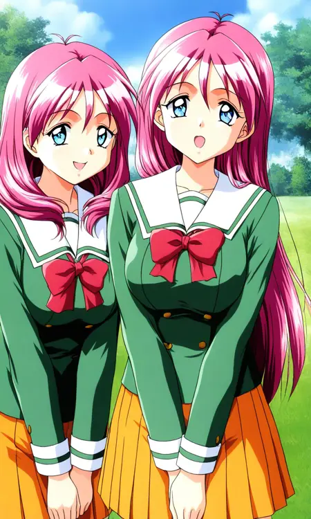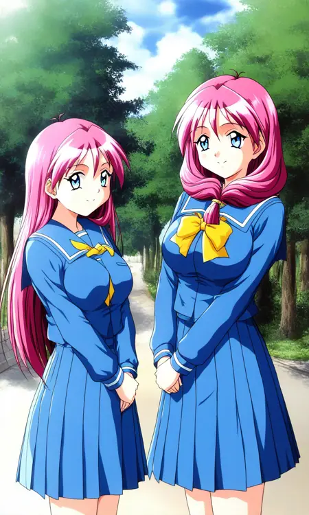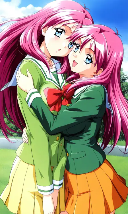 Shirayuki_Miho&Maho, pink hair, blue eyes, long hair, medium breasts,