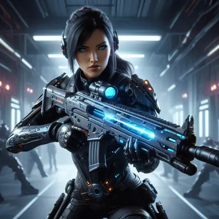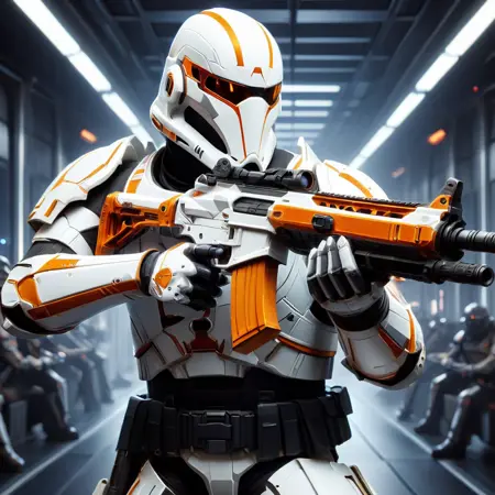 This model tends to make the person holding the rifle pointing left, for poiting right, have patience or test different prompts :-)