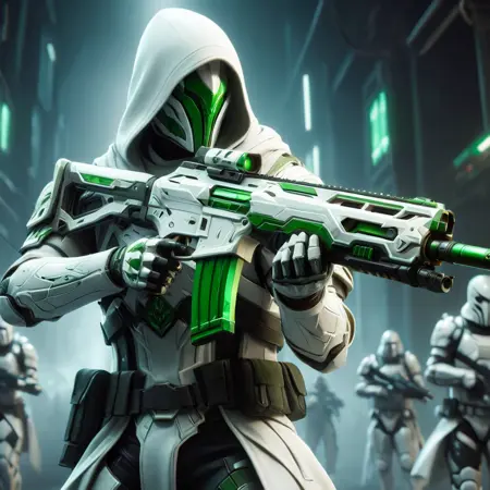 "score_9, score_8_up, score_7_up, score_6_up, score_5_up, score_4_up, (action shot of a fantasy game character wielding a white and green assault rifle, wearing white armor and hood, futuristic labb in background:1.2) vibrant, concept art, digital art, realistic"