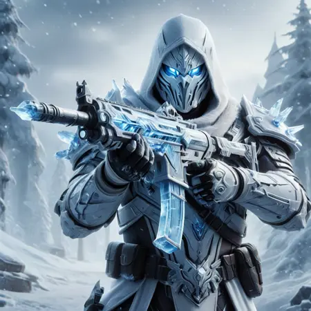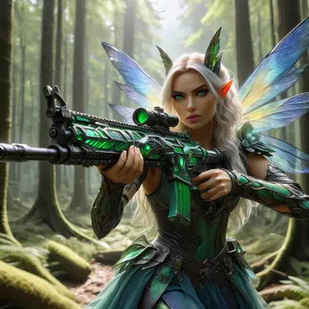 "score_9, score_8_up, score_7_up, score_6_up, score_5_up, score_4_up, (action shot of a fantasy game character wielding a white and green assault rifle, wearing white armor and hood, futuristic labb in background:1.2) vibrant, concept art, digital art, realistic"