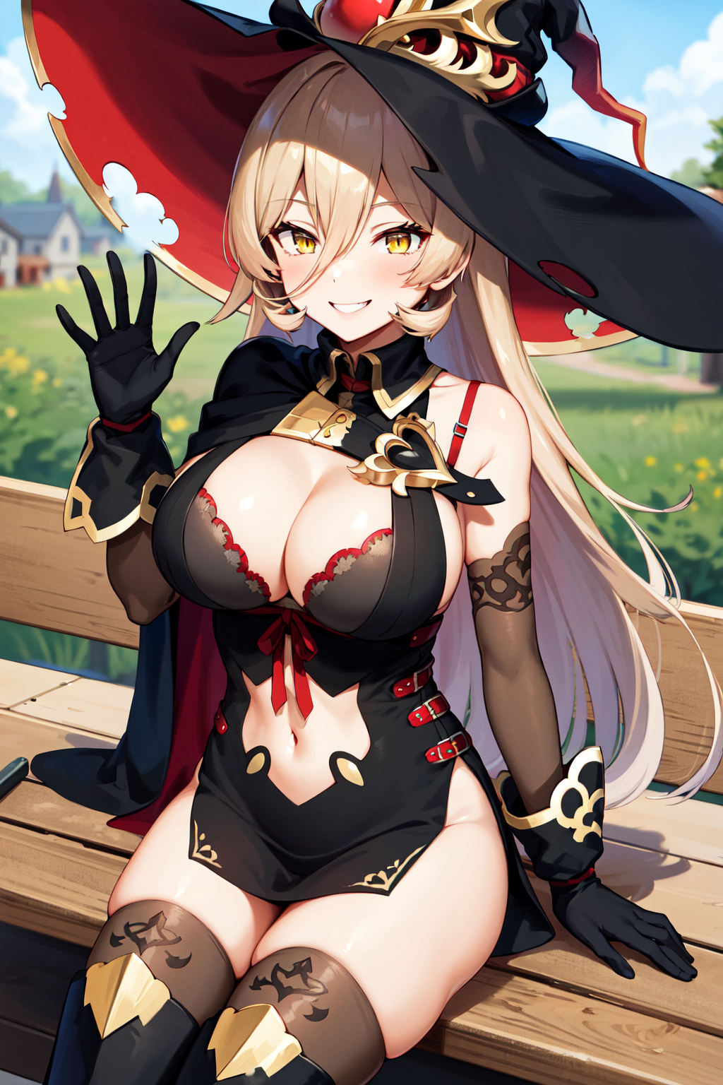 服装1aanui, 长发, 金发, 发丝垂于眼睛间, 黄色眼睛, 女巫帽, 黑色头饰, 斗篷, 暴露胸部, 文胸, 衣服镂空, 黑色连衣裙, 露脐, 肘部手套, 黑色手套, 黑色过膝袜, 大腿靴