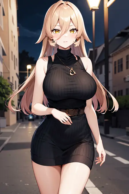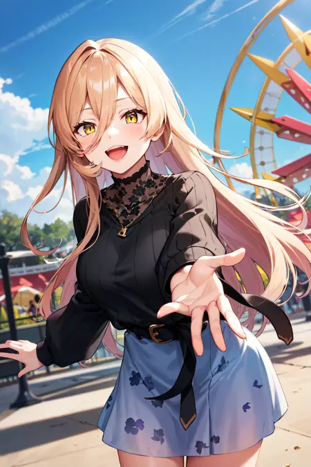 服装2bbnui, 长发, 金发, 发丝垂于眼睛间, 黄色眼睛, 饰品, 项链, 黑色毛衣, 长袖, 黑色腰带, 蓝色裙子, 印花裙