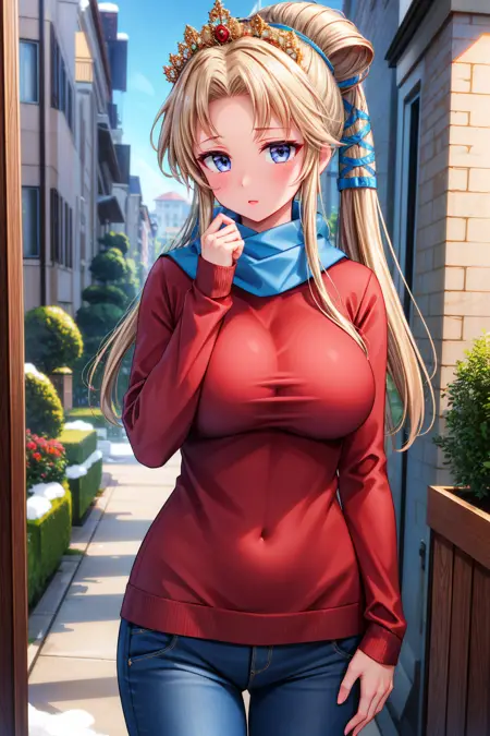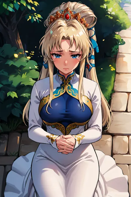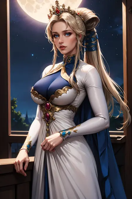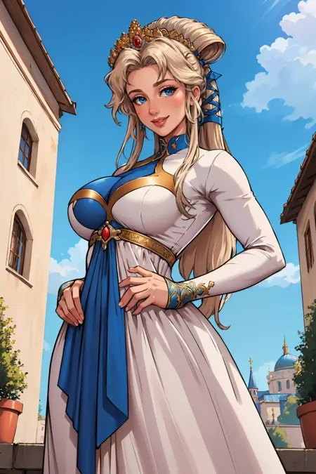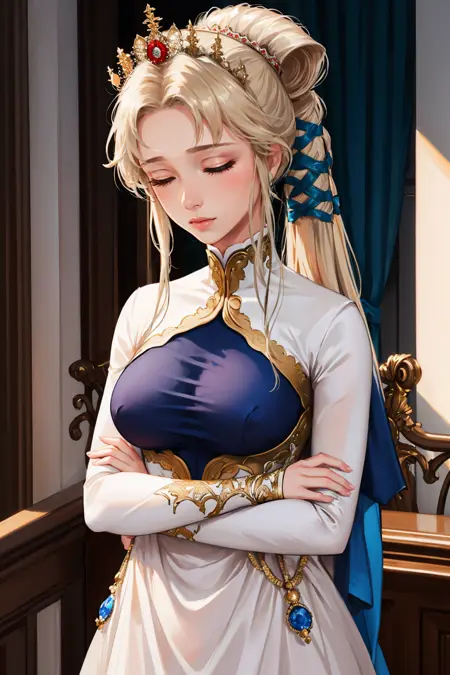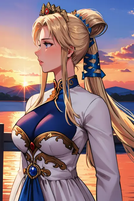 Add "hair ribbon, crown, white dress, long dress, long sleeves" for her typical look.