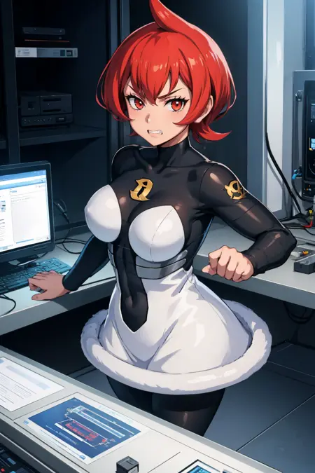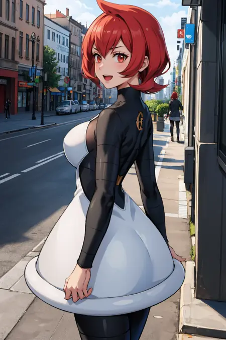 Add "black and white dress, long sleeves, black pantyhose" for her typical look.