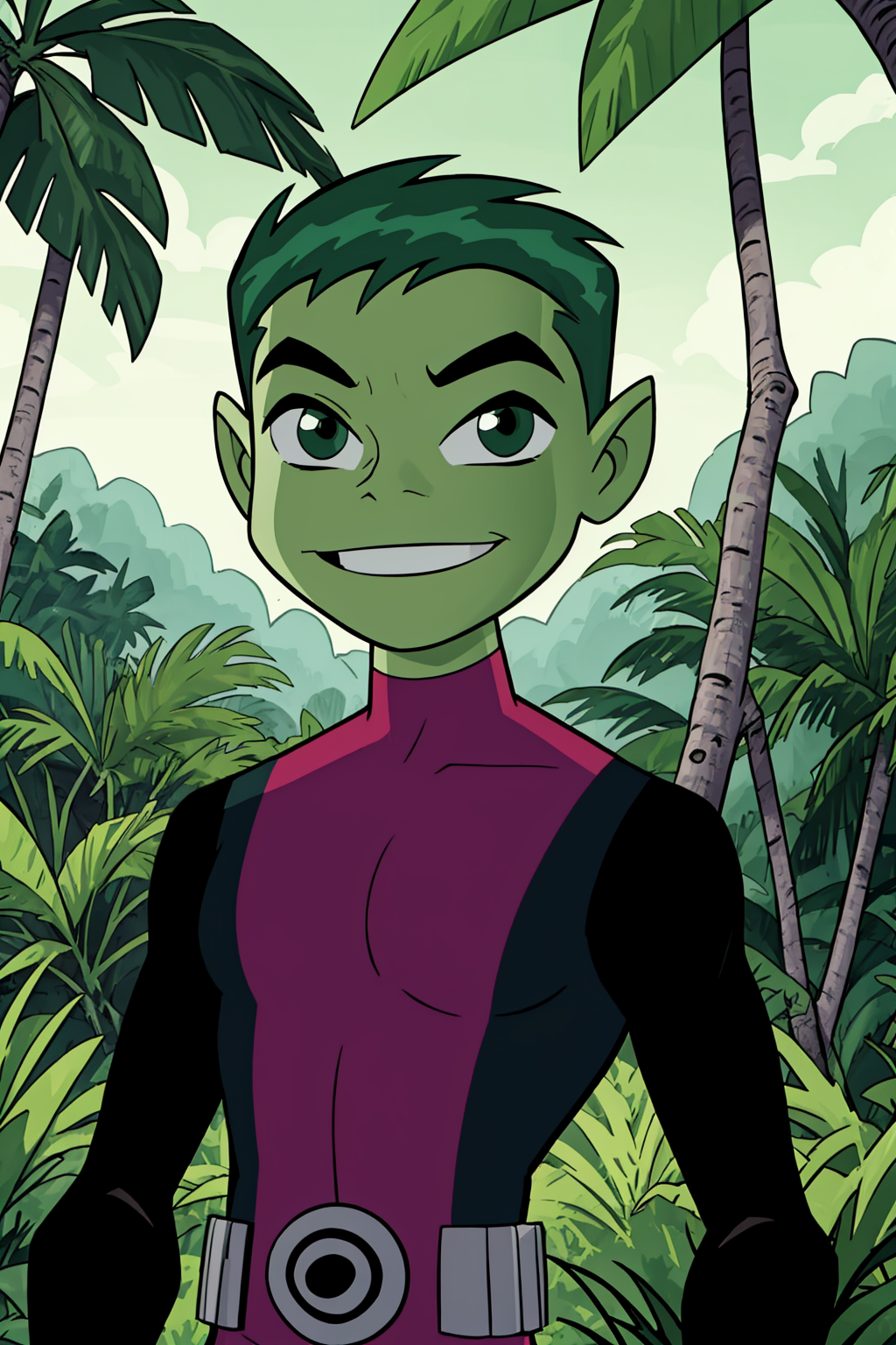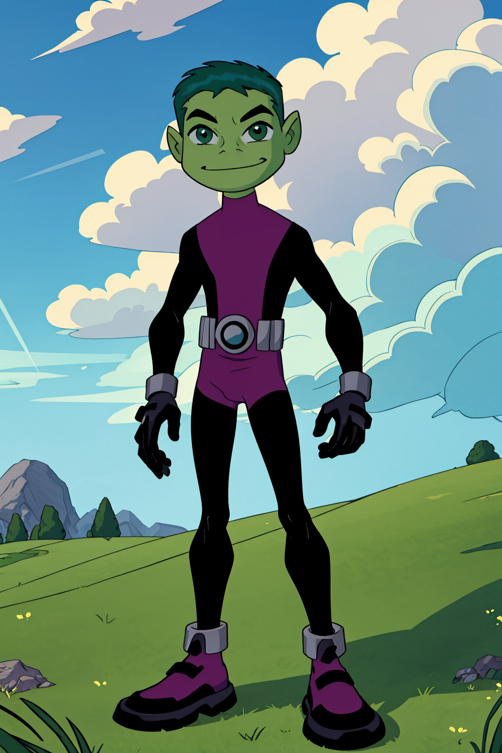 Other prompts : 1boy, green hair, short hair, green eyes, green skin, bodysuit, gloves, belt, fang, pointy ears