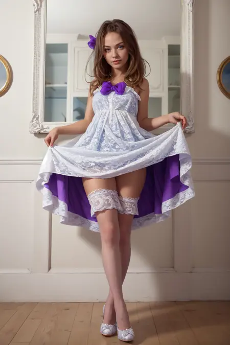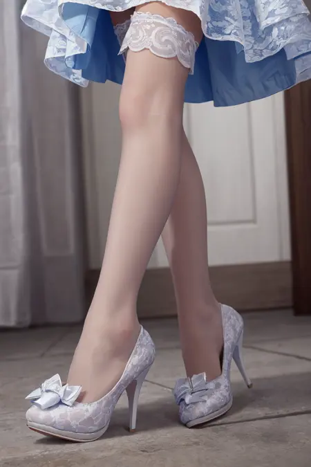 •     white lace-trimmed dress, white lace high heels, white lace-trimmed thighhighs, lace, lace trim