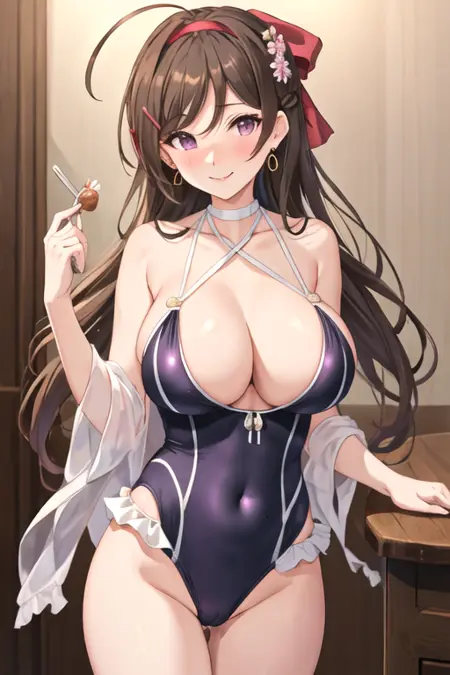 触发词为mamiya_kantaicollection,推荐标签为:best quality, masterpiece, highres, solo, {mamiya_kantaicollection:1.15}, brown_hair, long_hair, ribbon, hair_ornament, hairclip, hair_ribbon, ahoge, breasts, large_breasts, smile, blush, red_eyes, purple_eyes