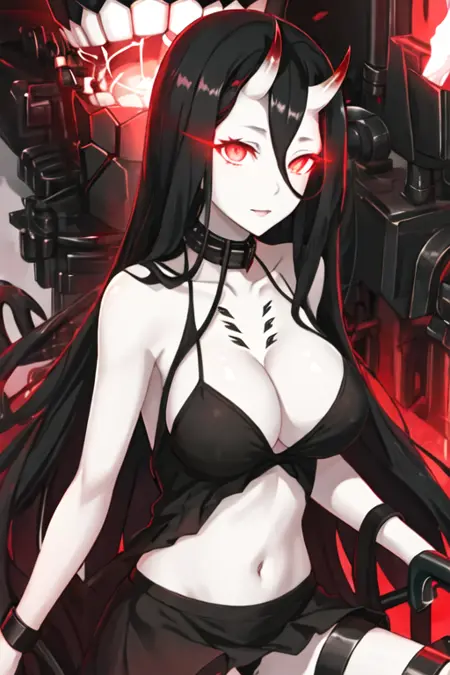 The trigger word is battleship_symbiotic_hime_kantaicollection, and the recommended tags are best quality, masterpiece, highres, solo, {battleship_symbiotic_hime_kantaicollection:1.15}, horns, long_hair, abyssal_ship, black_hair, red_eyes, oni_horns, pale_skin, breasts, large_breasts, hair_between_eyes, very_long_hair, glowing_eyes, glowing, cleavage, colored_skin.