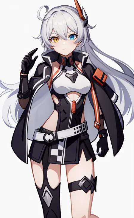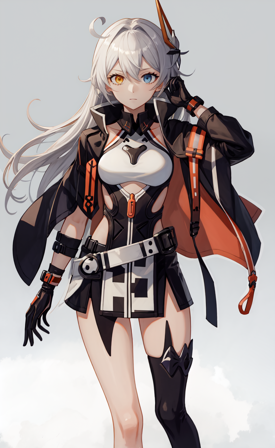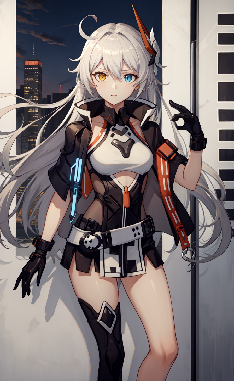 kiana_kaslana,solo,long_hair,heterochromia,gloves,black_gloves,blue_eyes,bangs,yellow_eyes,white_hair,hair_ornament,black_jacket,(single thighhigh:1.2),jacket,dress,black_dress,belt,hair_between_eyes,