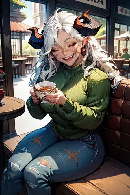 Trigger : desmos, scars, horns, headband, fur shoulders, choker, cloak, bikini armor, fur arm guards, loincloth, multiple thigh straps, fur boots