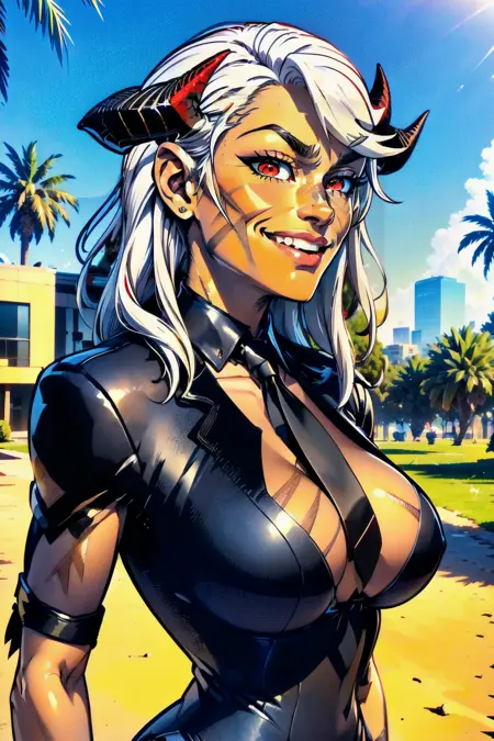 Trigger BW : desmos, scars, fur shoulders, horns, headband, skimpy outfit, cape