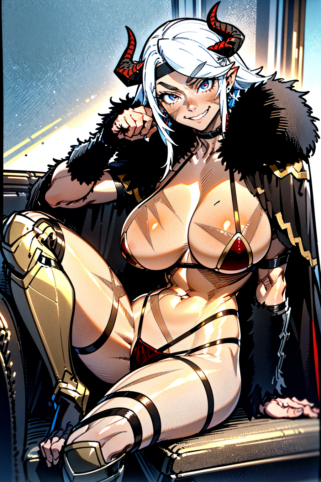 Trigger : desmos, scars, horns, headband, fur shoulders, choker, cloak, bikini armor, fur arm guards, loincloth, multiple thigh straps, fur boots