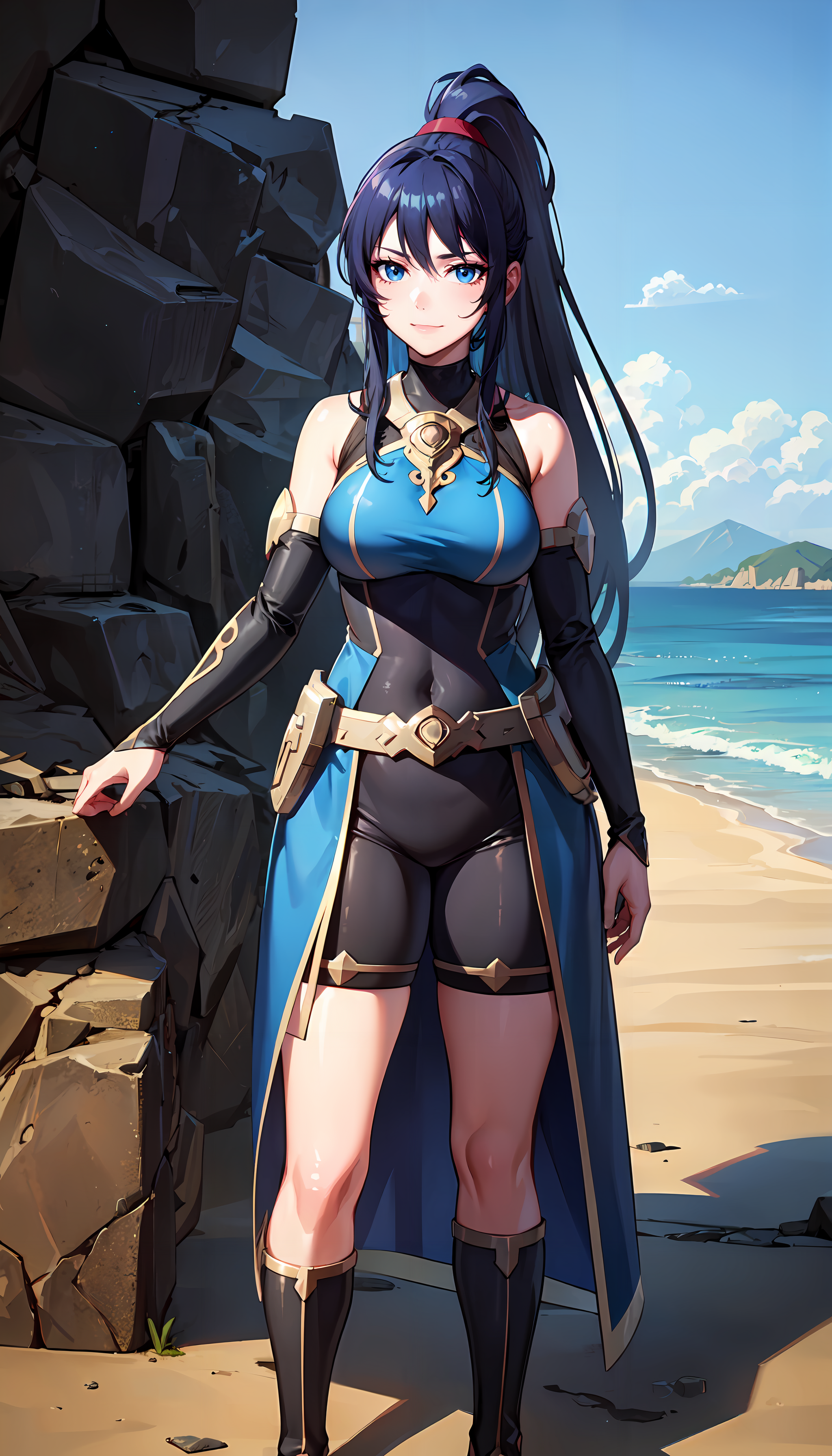 blue hair, long hair, ponytail, bangs, light blue eyes, detached sleeves, black sleeves, blue top, black sleeves, blue waist cape, halterneck, black undershirt