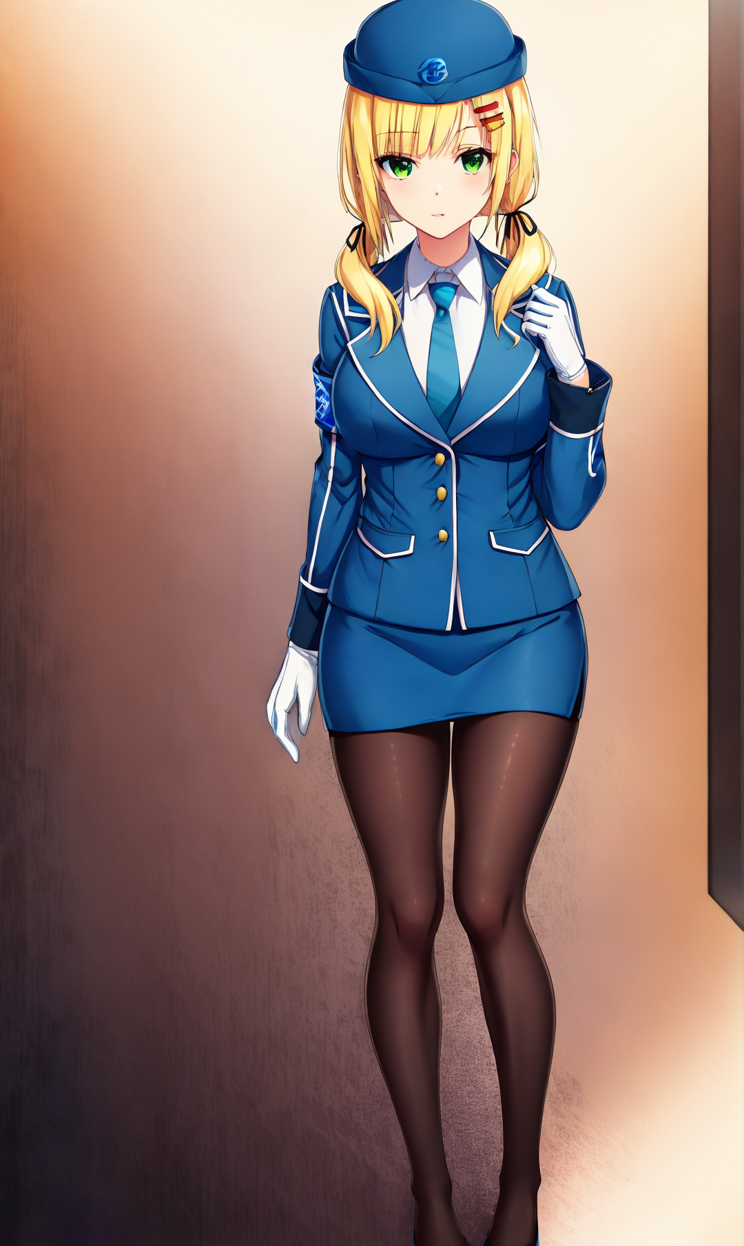 emilia_krt_girls, 1girl, solo, long hair, skirt, blonde hair, shirt, hair ornament, gloves, long sleeves, hat, ribbon, twintails, green eyes, jacket, hair ribbon, pantyhose, necktie, shoes, hairclip, striped, white gloves, miniskirt, uniform, blue skirt, black pantyhose, black ribbon, low twintails, blue jacket, armband, blue headwear, pencil skirt, blue necktie, striped necktie,