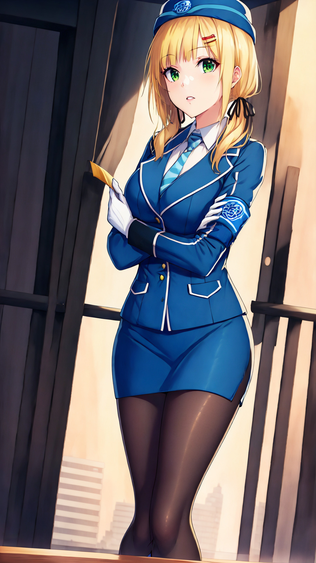 hat, uniform, white shirt, long sleeves, blue jacket, blazer, blue necktie, striped necktie, diagonal-striped necktie, armband, white gloves, blue skirt, pencil skirt, miniskirt, black pantyhose, black footwear, high heels
