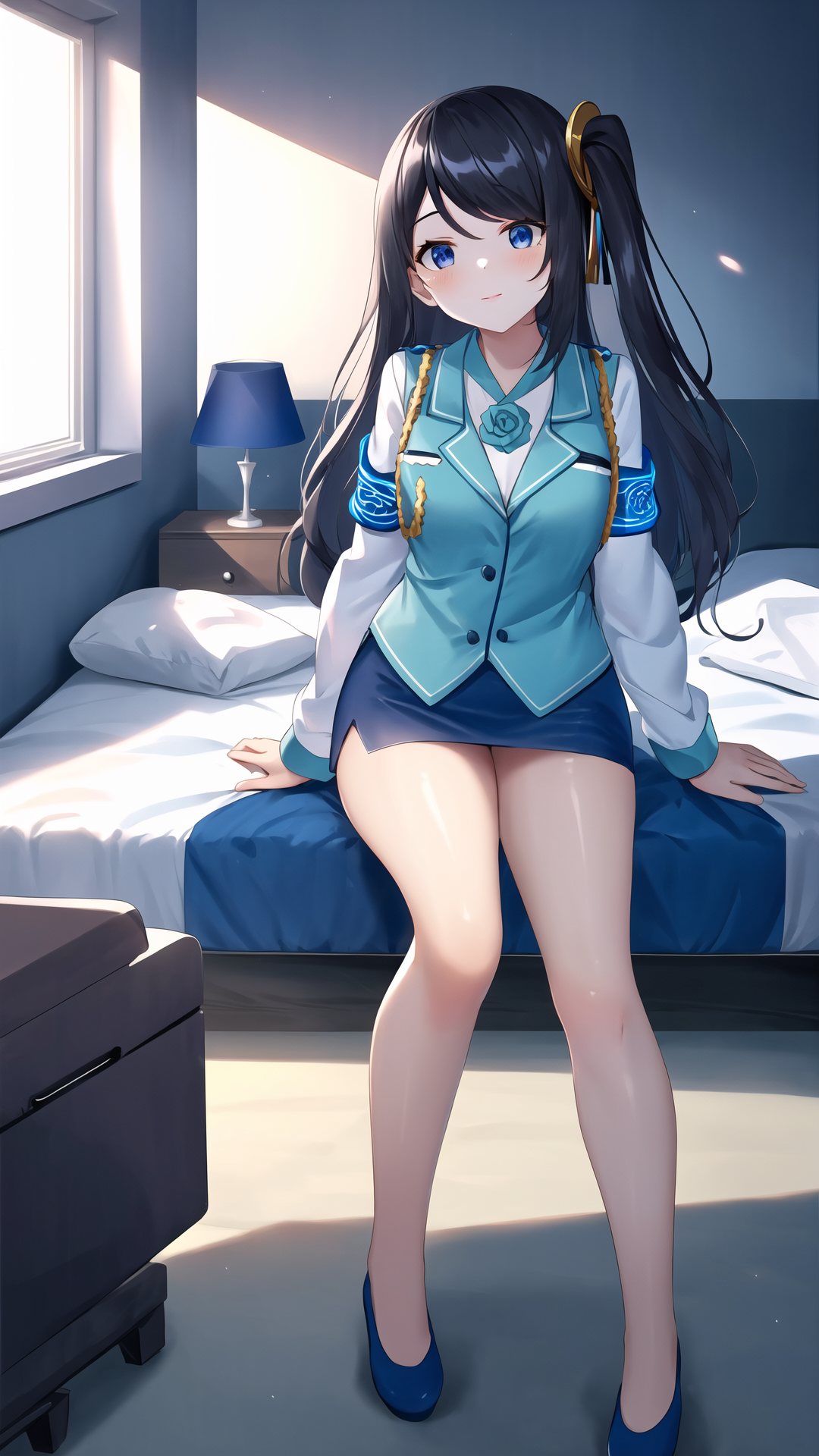 skirt, shirt, long sleeves, white shirt, shoes, vest, blue skirt, armband, pencil skirt, blue footwear, blue vest, flower, rose, one side up
