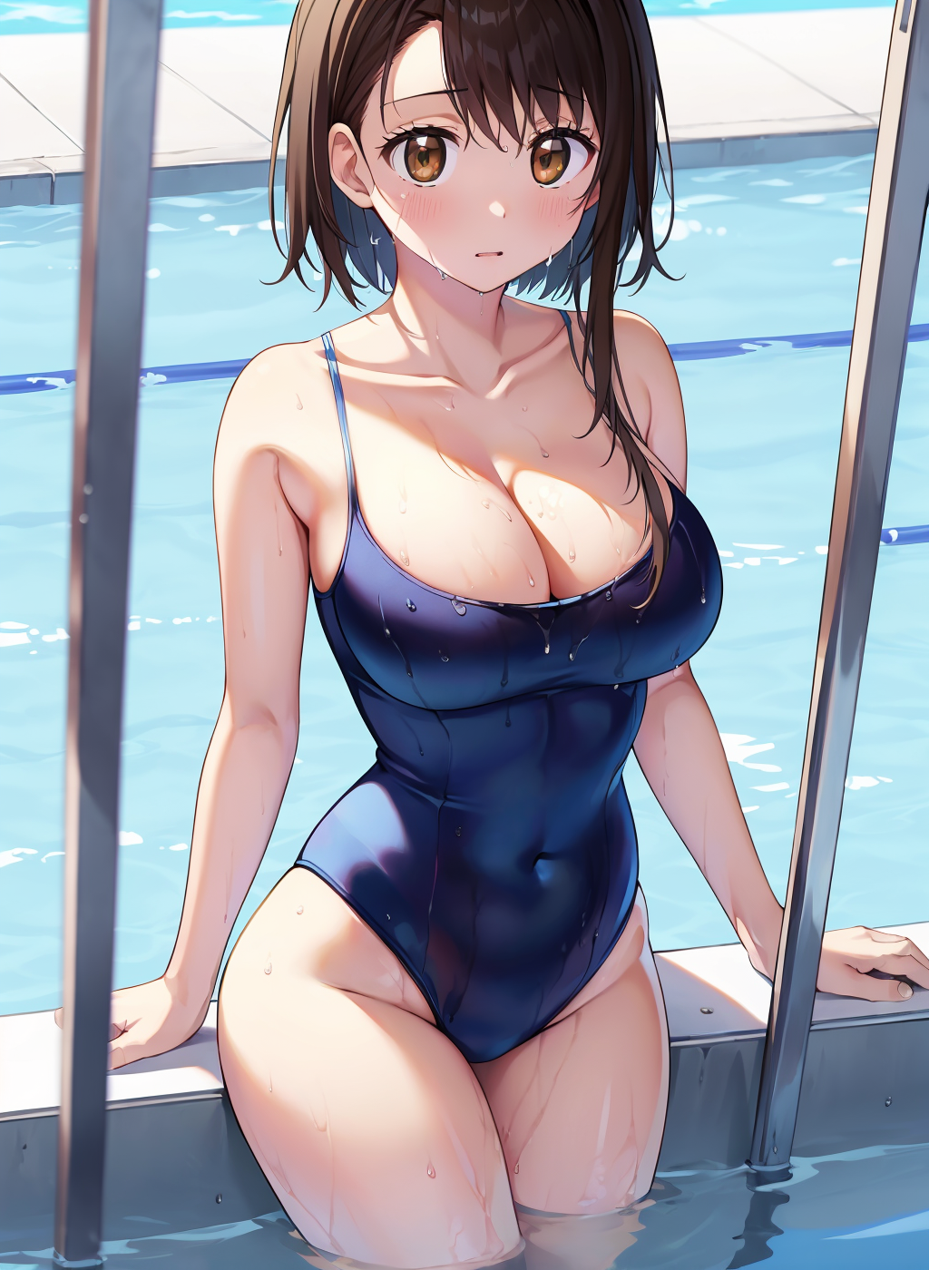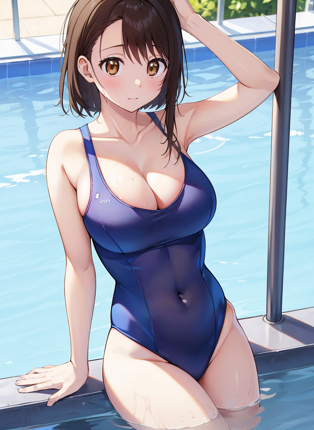 onodera_kosaki, 1girl, solo, blush, brown hair, black hair, cleavage, bare shoulders, brown eyes, medium breasts, collarbone, swimsuit, one-piece swimsuit, covered navel, school swimsuit, blue one-piece swimsuit, competition school swimsuit, one-piece swimsuit pull, barefoot