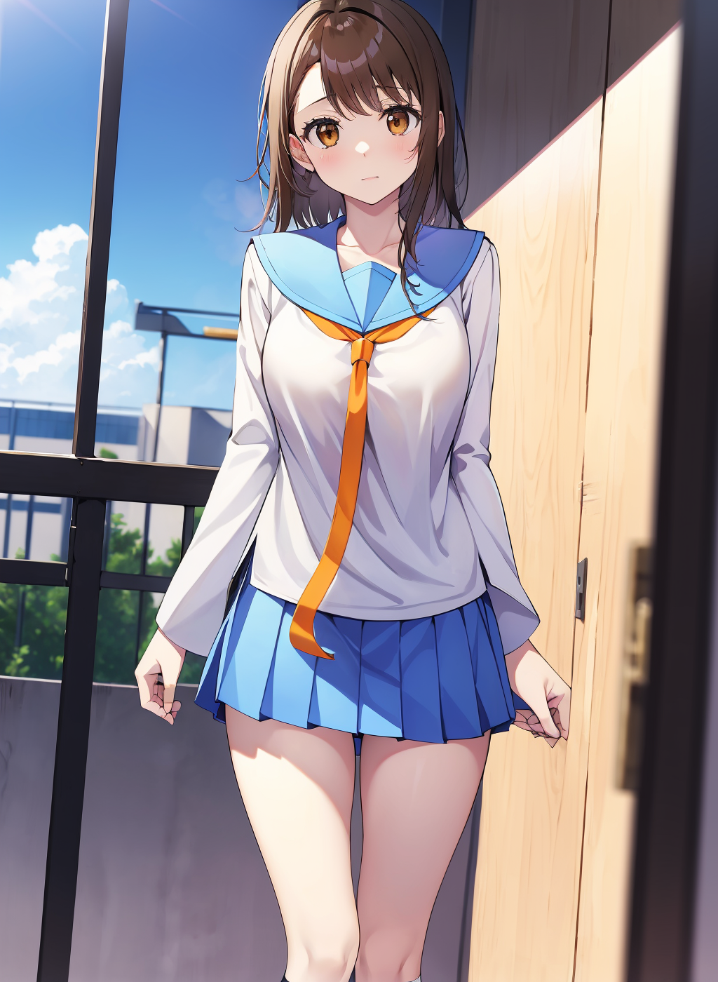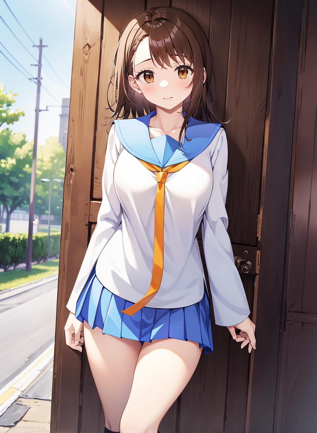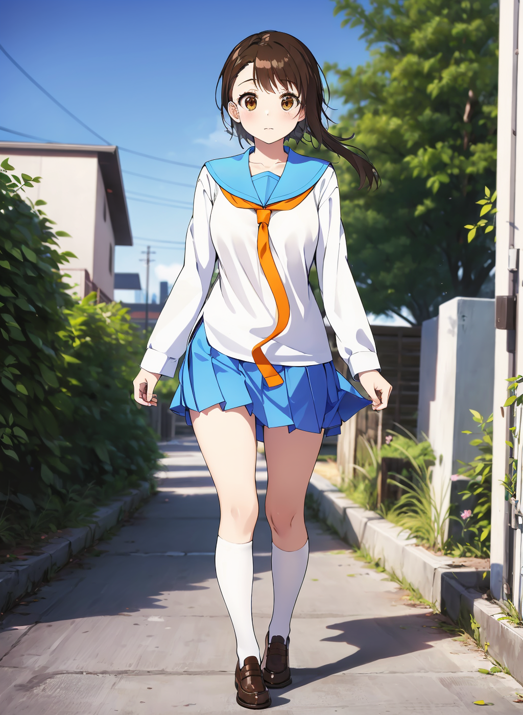 onodera_kosaki, 1girl, solo, long hair, skirt, brown hair, brown eyes, school uniform, pleated skirt, shoes, serafuku, socks, blue skirt, kneehighs, white socks, necktie, orange necktie, sailor collar, blue sailor collar, collarbone, shirt, white shirt, miniskirt