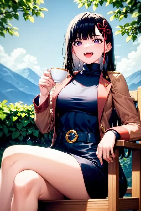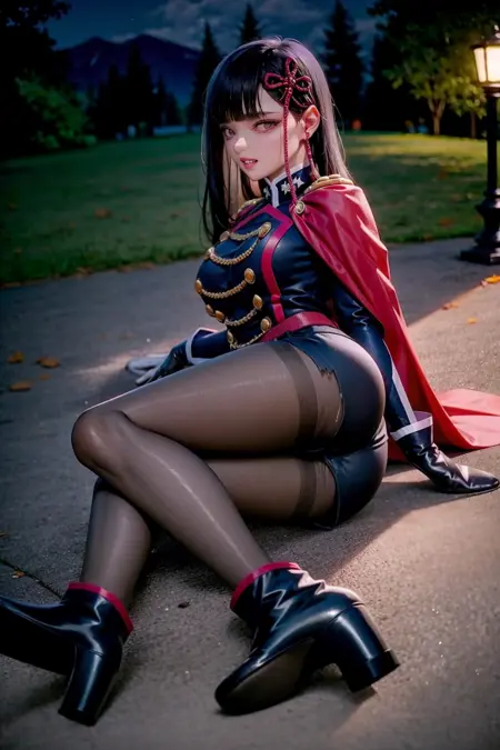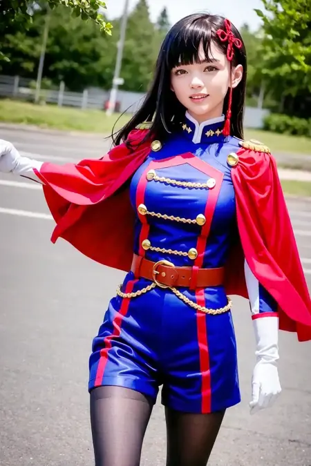 tag:1girl,purple hair, long hair,purple eyes,hair ribbon, hair ornament,epaulettes,aiguillette, red cape, double-breasted,military uniform,long sleeves,white gloves, shorts,belt,black pantyhose,