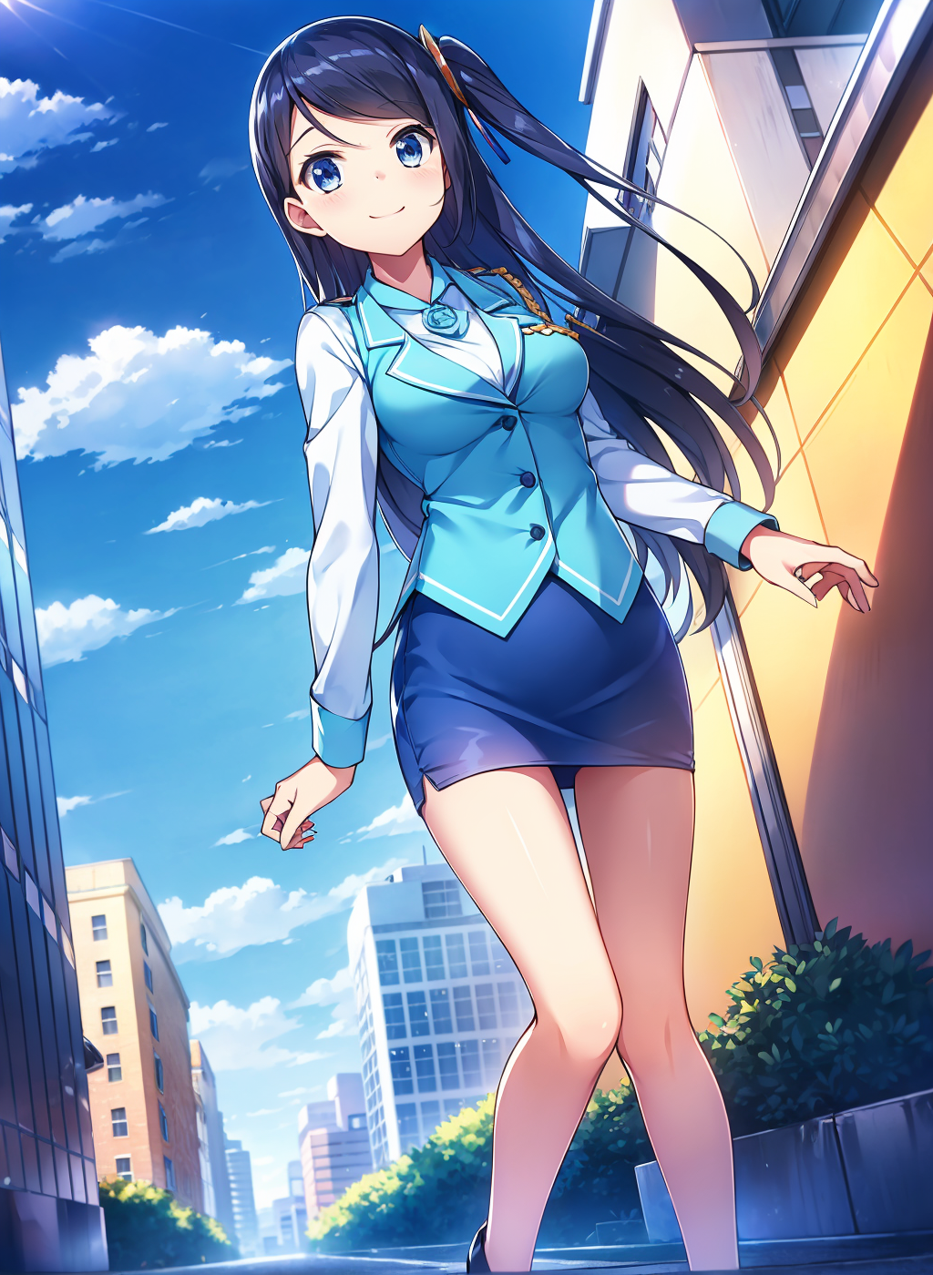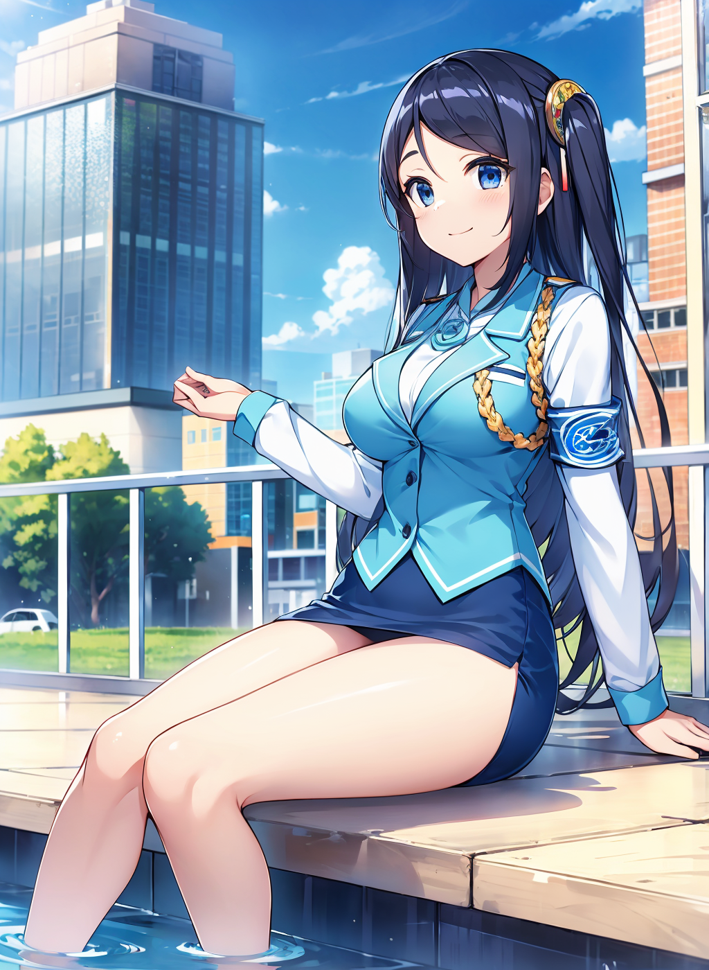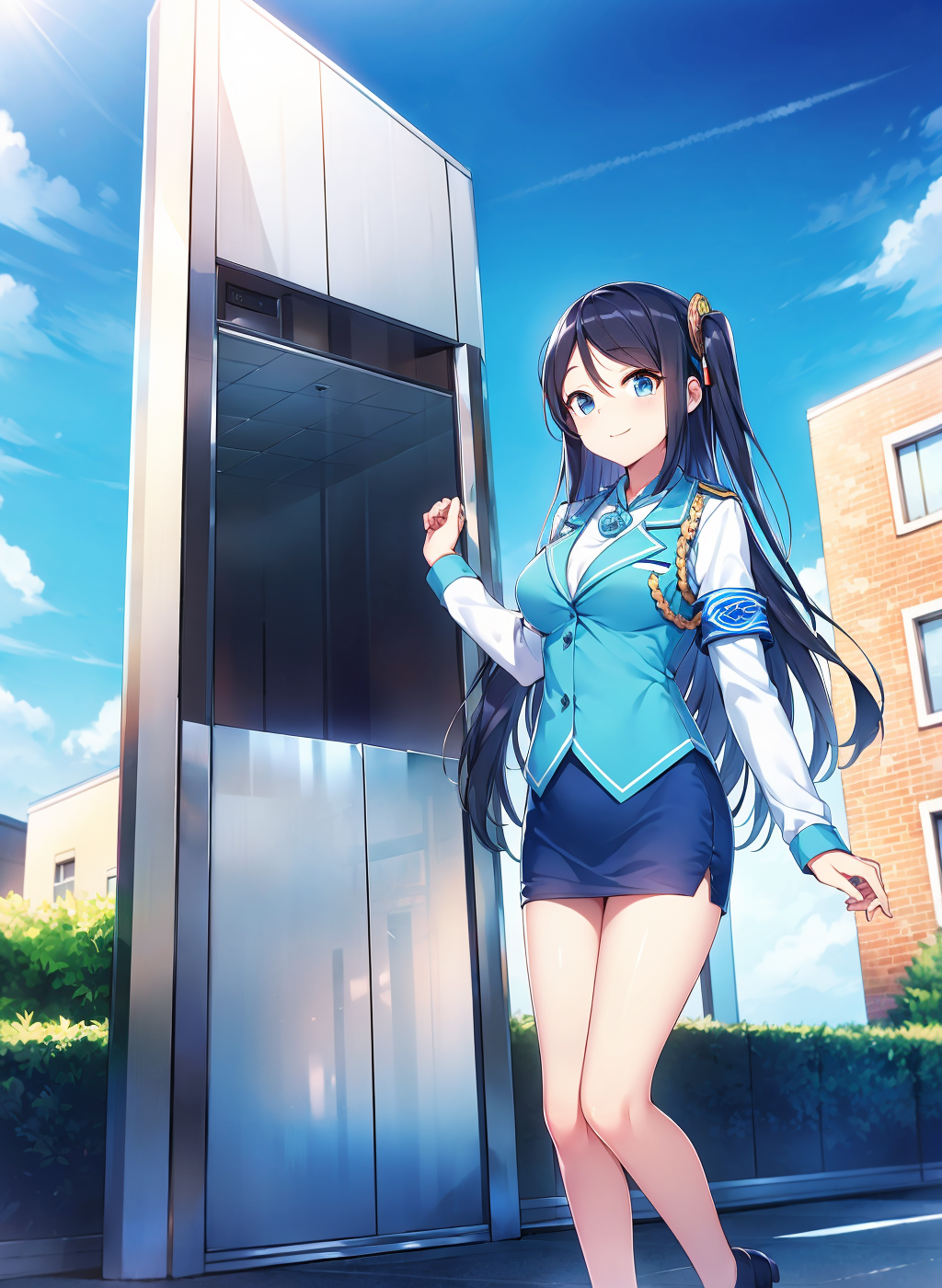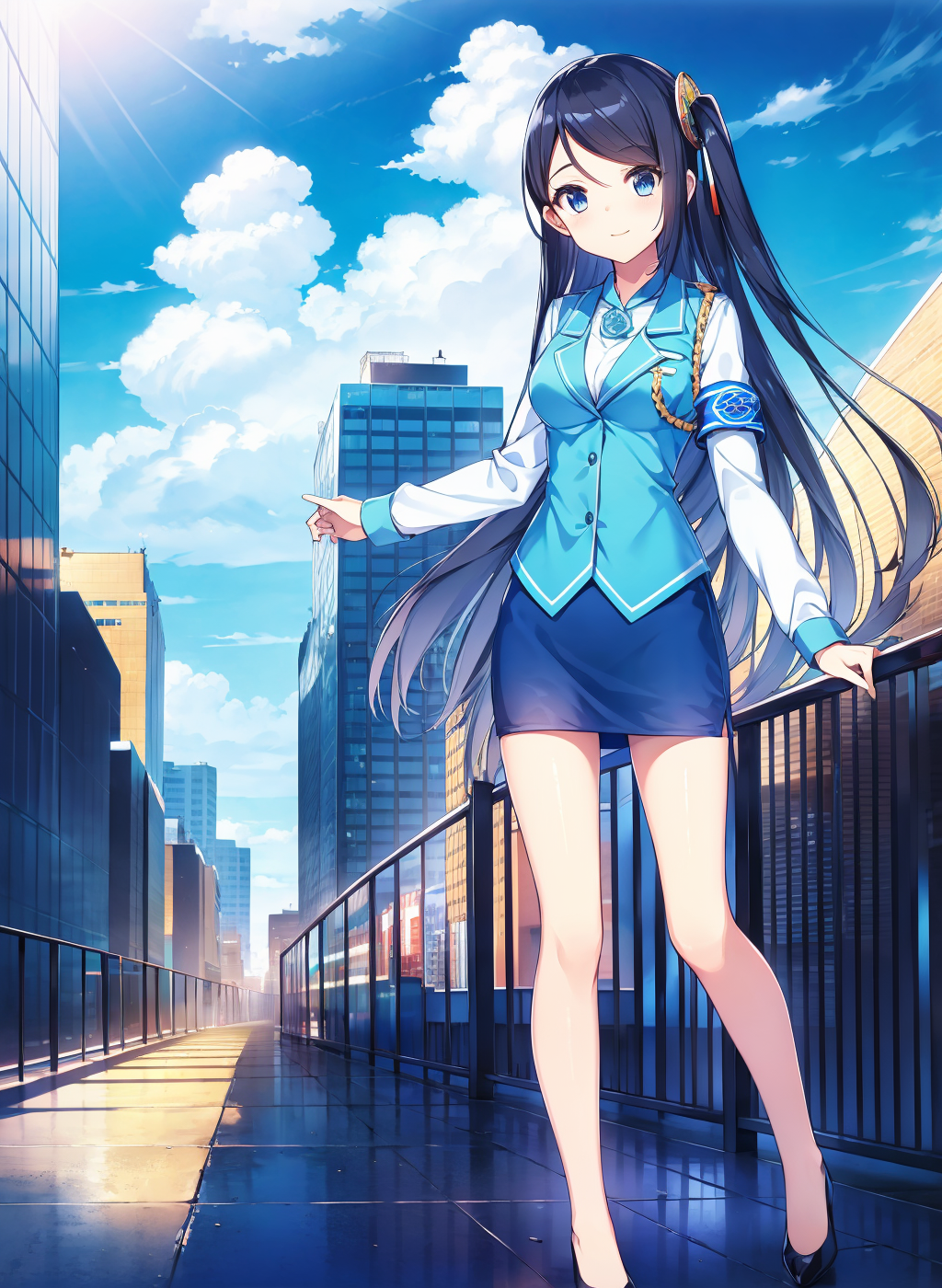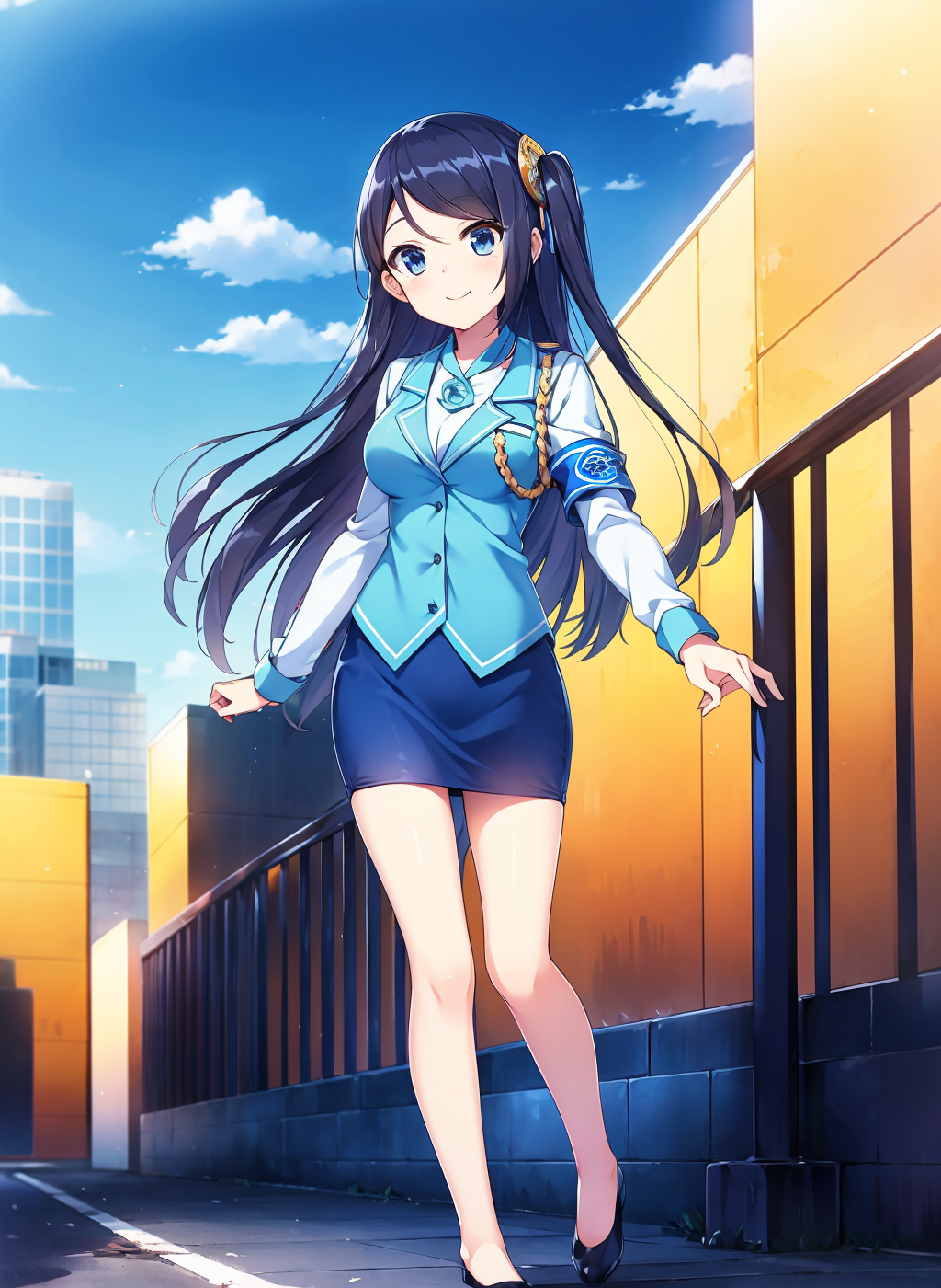 skirt, shirt, long sleeves, white shirt, necktie, shoes, collared shirt, miniskirt, black footwear, uniform, vest, blue skirt, one side up, armband, pencil skirt, blue vest
