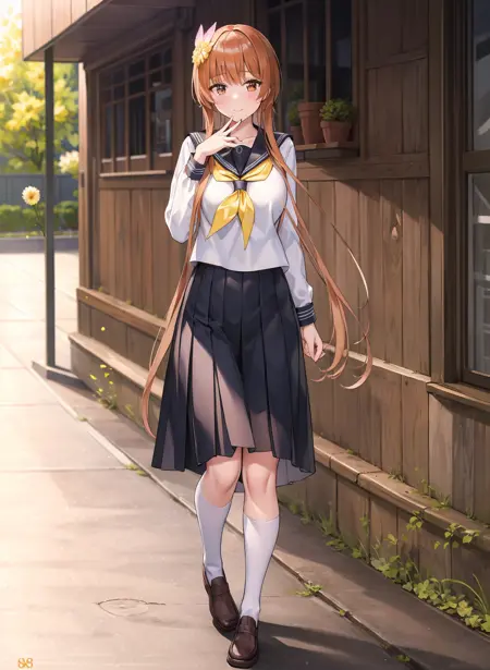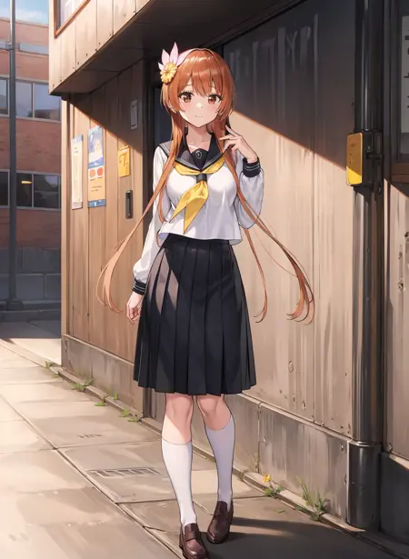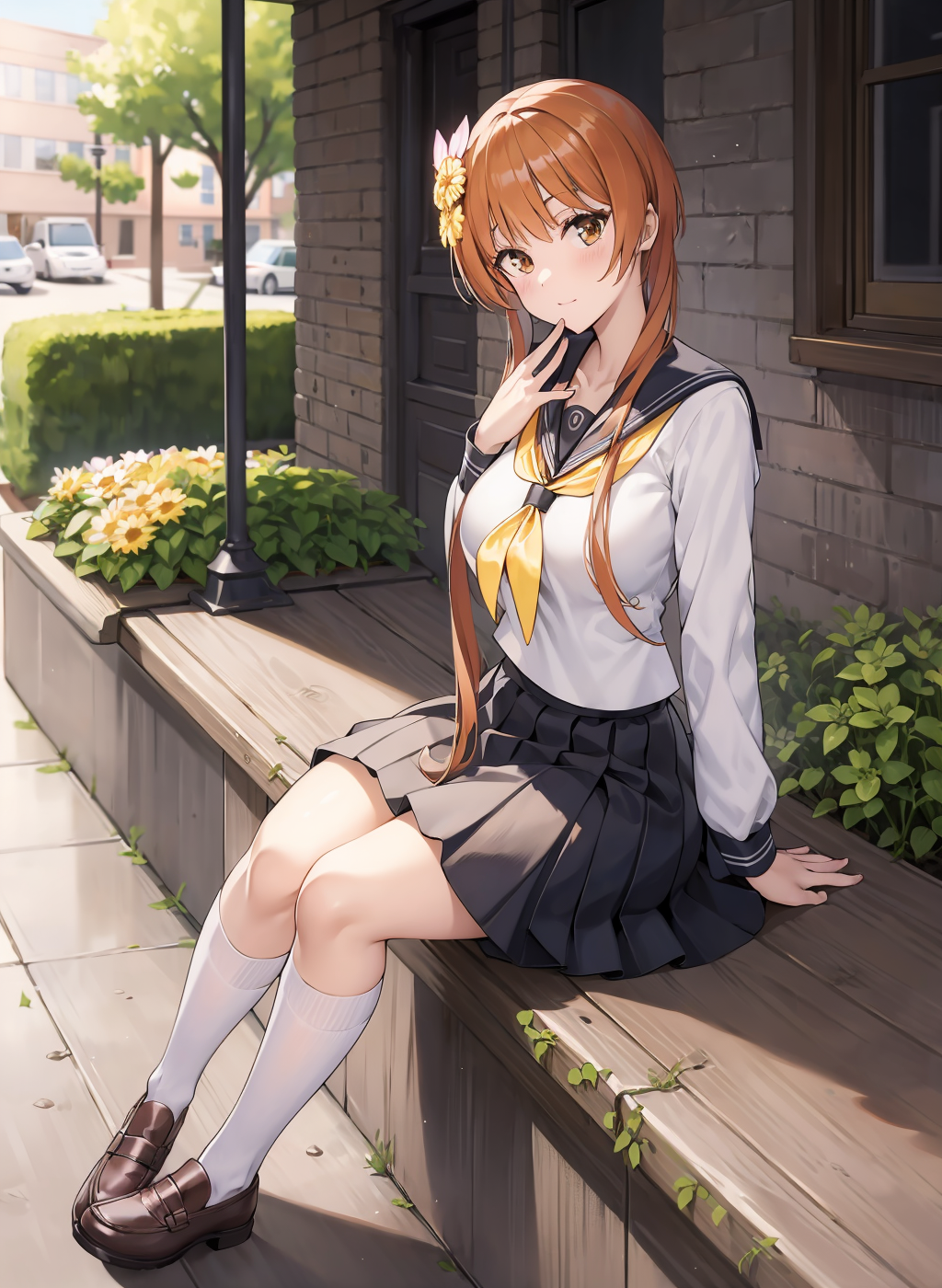 tachibana_marika, 1girl, solo, long hair, skirt, brown hair, shirt, hair ornament, brown eyes, very long hair, school uniform, white shirt, flower, pleated skirt, shoes, serafuku, socks, hair flower, black skirt, sailor collar, neckerchief, kneehighs, brown footwear, white socks, loafers, short hair with long locks, black sailor collar, long skirt, sailor shirt, yellow neckerchief