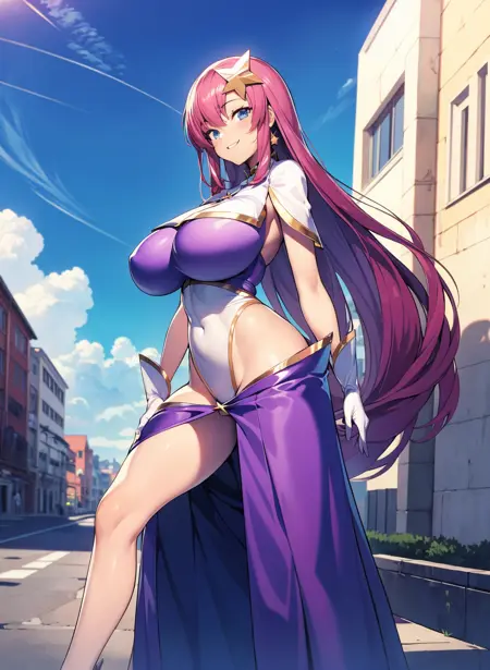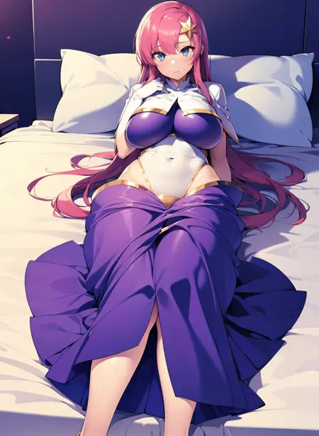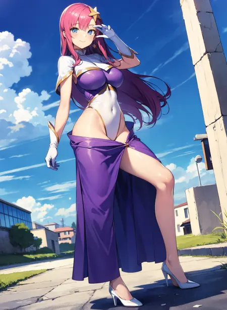 meer_campbell, 1girl, solo, long hair, blue eyes, skirt, hair ornament, gloves, pink hair, white gloves, star (symbol), high heels, leotard, covered navel, highleg, highleg leotard, star hair ornament, white leotard, purple leotard