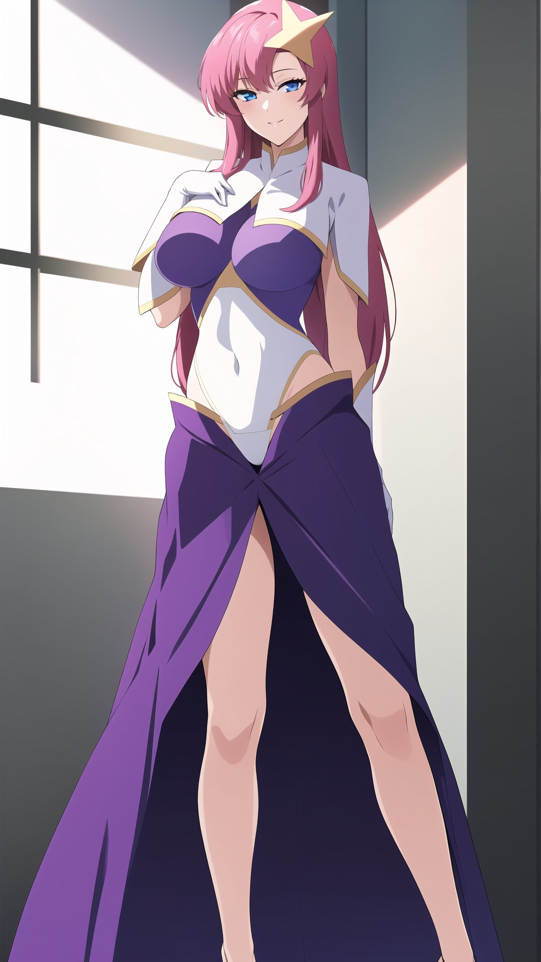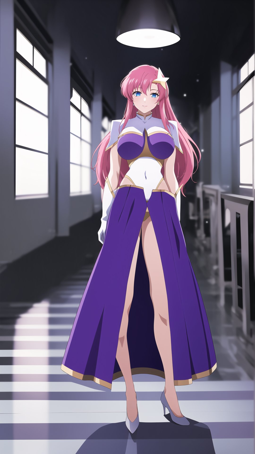 meer_campbell, 1girl, solo, long hair, blue eyes, skirt, hair ornament, gloves, pink hair, white gloves, star (symbol), high heels, leotard, covered navel, highleg, highleg leotard, star hair ornament, white leotard, purple leotard