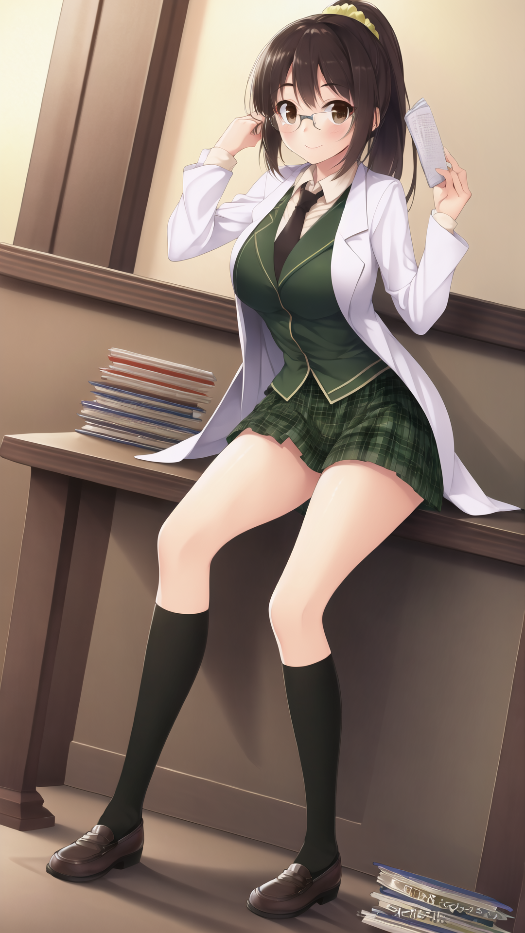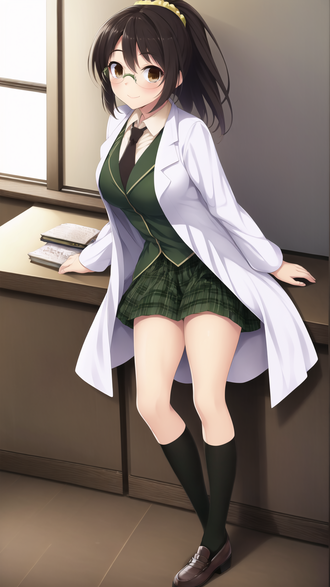 shiguma_rika, 1girl, solo, long hair, looking at viewer, smile, skirt, brown hair, hair ornament, brown eyes, school uniform, ponytail, pleated skirt, necktie, glasses, shoes, socks, book, plaid, kneehighs, plaid skirt, scrunchie, green skirt, black socks, loafers, labcoat, st. chronica academy school uniform,