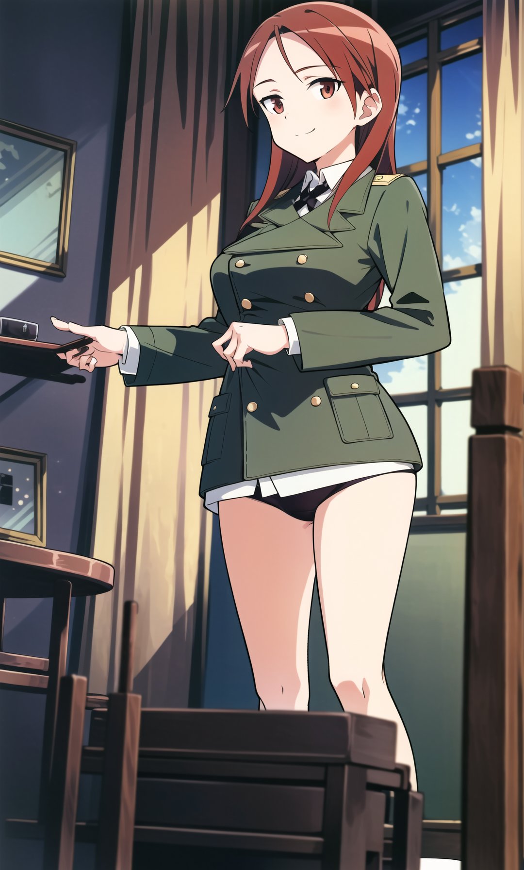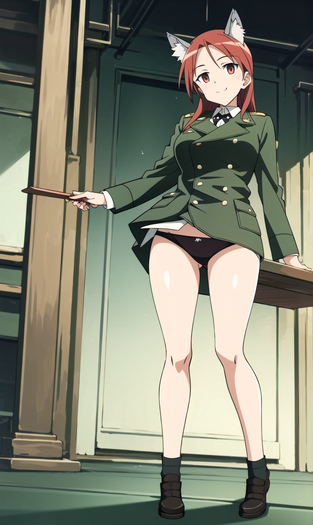 minna_dietlinde_wilcke, 1girl, solo, long hair, red eyes, underwear, panties, red hair, uniform, military, military uniform, jacket, green jacket, wolf ears, wolf tail, wolf girl,