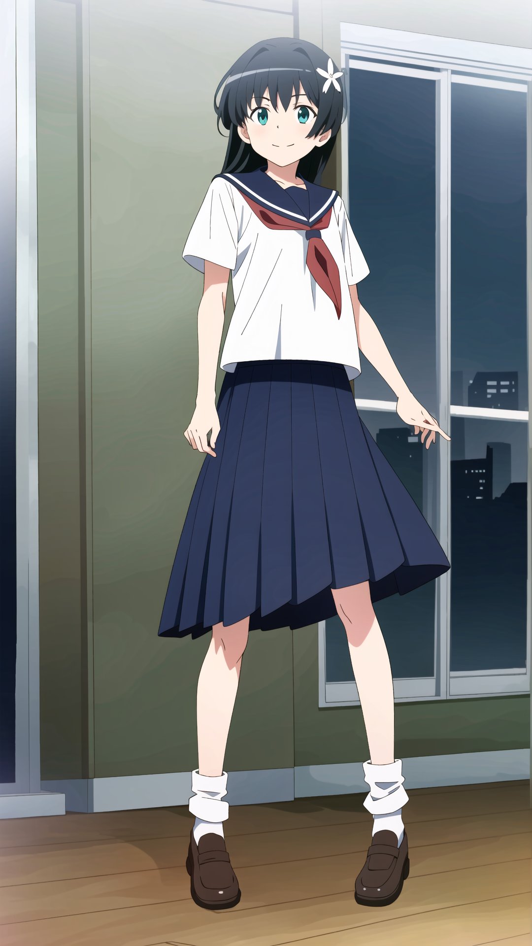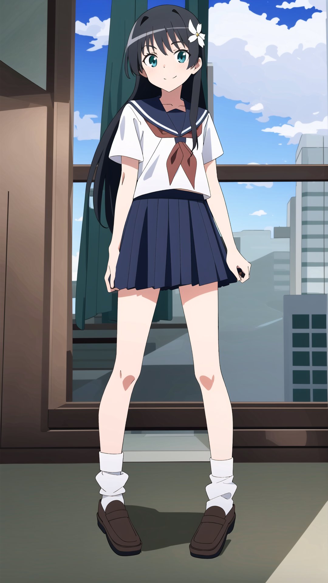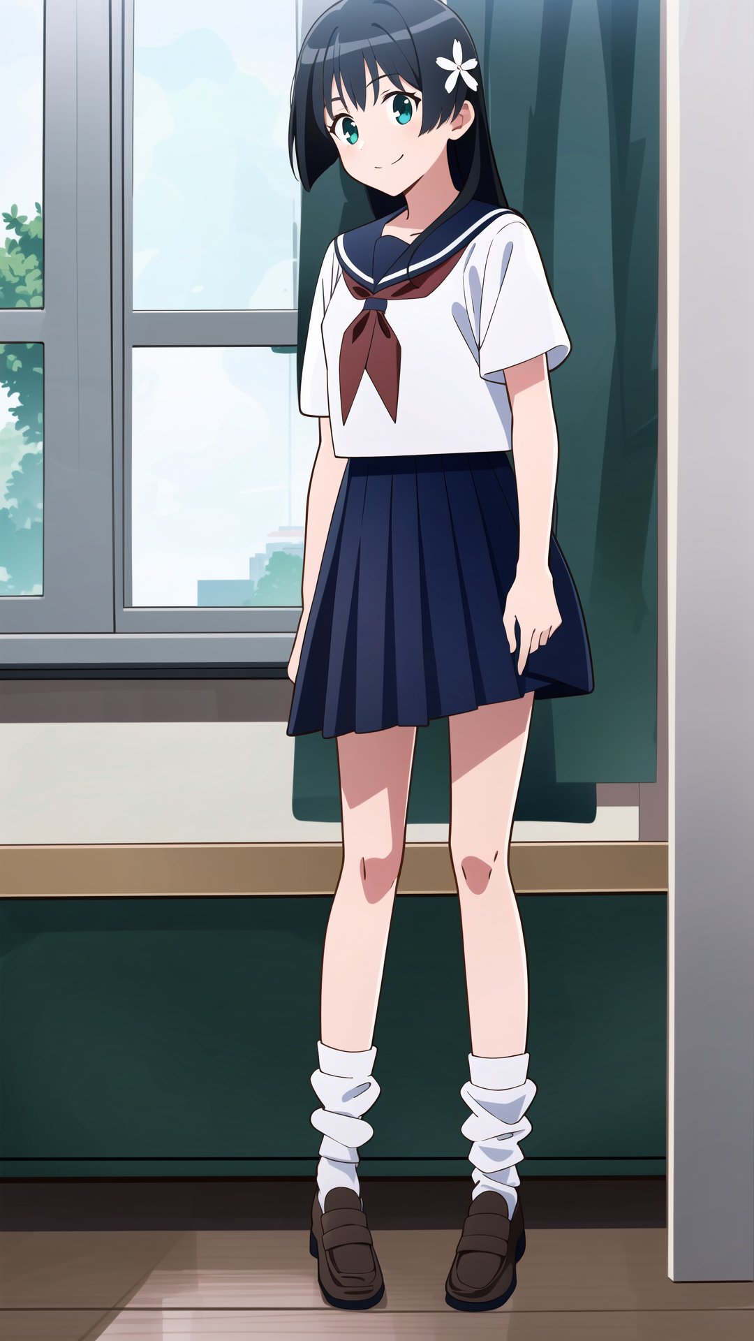 saten_ruiko, 1girl, solo, long hair, skirt, shirt, black hair, hair ornament, holding, school uniform, green eyes, white shirt, flower, short sleeves, pleated skirt, shoes, serafuku, socks, hair flower, sailor collar, black footwear, blue skirt, neckerchief, brown footwear, white socks, blue sailor collar, loafers, red neckerchief, sakugawa school uniform