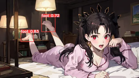 キャンバスの大部分を占める足の画像では、検出される場合、部分的に検出される場合、片方だけ検出される場合があります。実際、このモデルはこのような画像を意図して設計されていません。トレーニングデータにこのような画像が含まれていたとしても、このモデルの目的は、足をターゲットに全体のキャンバスを切り抜き、足のリファインに多くの画像生成リソースを割くことです。もし足がすでに画像の主役で、キャンバスの50%以上を占めている場合、このモデルはターゲットのリファインにほとんど役立ちません。それでもご希望があれば使用できますが、使用方法によっては問題が増える可能性があります。
