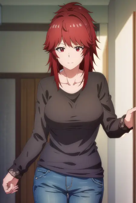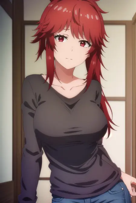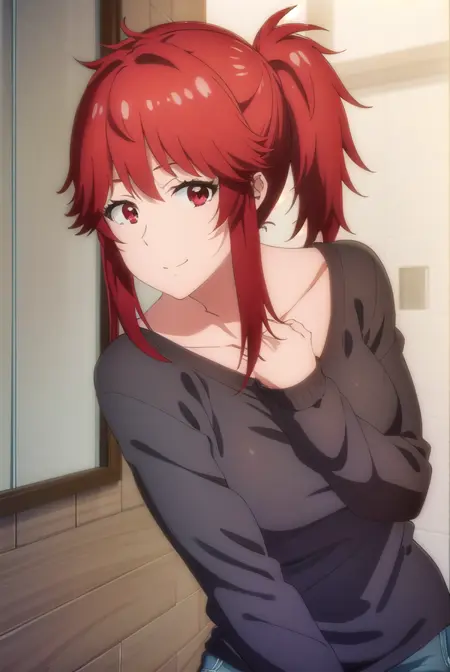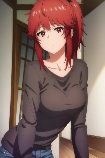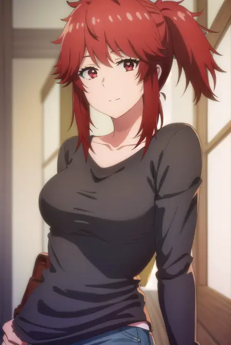 akemi aizawa, (red eyes:1.3), red hair, medium hair, ponytail,